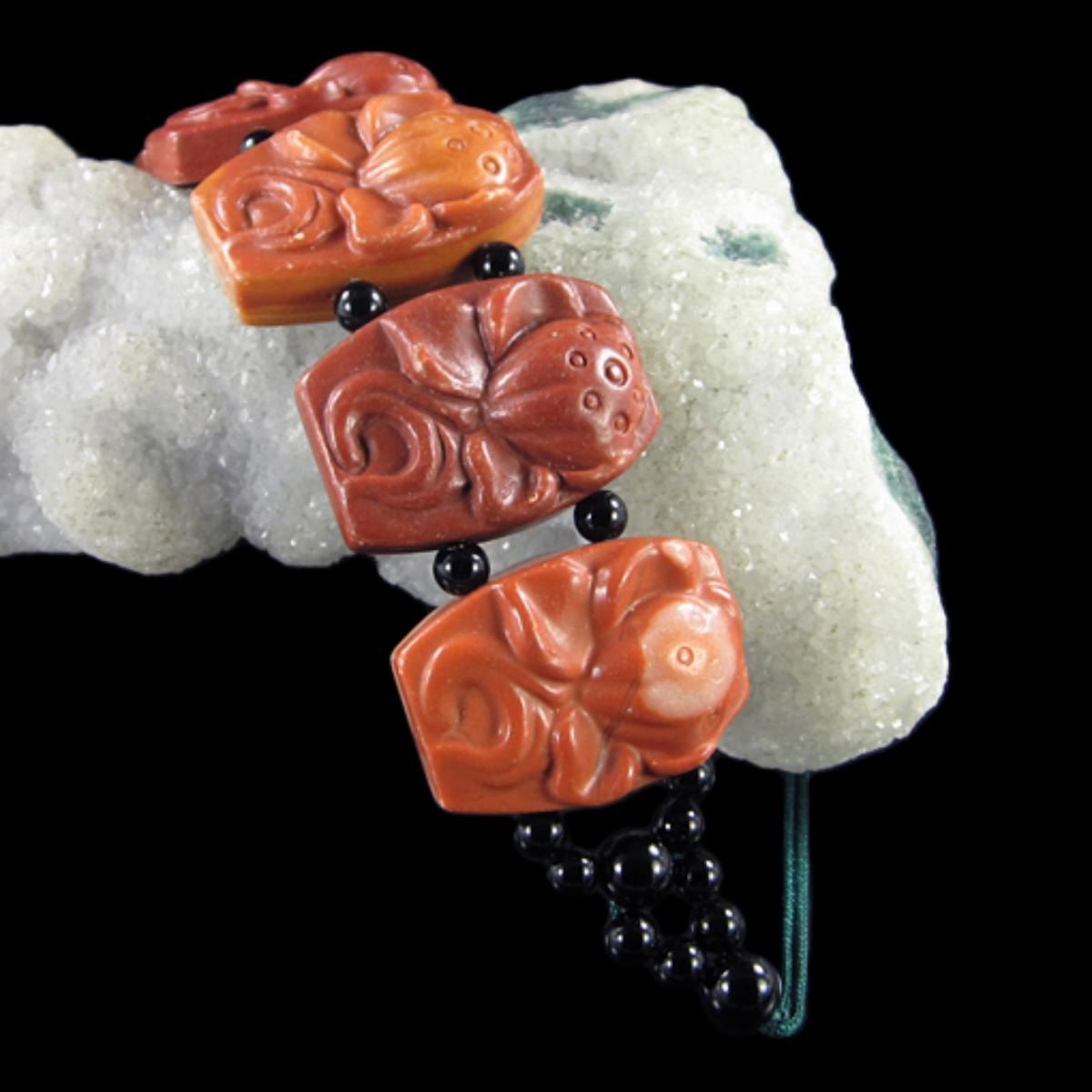 *Stone Name Red Malachite Lotus *Stone Overall Dimension for each bead 28x20x10 mm (1.102x0.787x0.394 inch ) *Weight 270 ct/ 54 g/ 1.904796 oz*Handcrafted knot chain;Other Stones used in this Bracelet Red Malachite;*Center Stone Properties *Locality unknown *Appearance opaque *Color red off-white band *Mohs Hardness 4.5 *Source Natural *Treatments None *Drilled YES diameter 2.5/36-3/36 inch *Other Names banded jasper~~~~~~~~~(+) Each step of our Lapidary work is under tight quality control . With the best pattern-color combination possible in mind the initial cut was done by experienced lapidary ... The last-step diamond polishing makes the surface of each bead/cab mirror-like glossy that meet the highest standard possible. Finally only those met all quality requirements are selected.