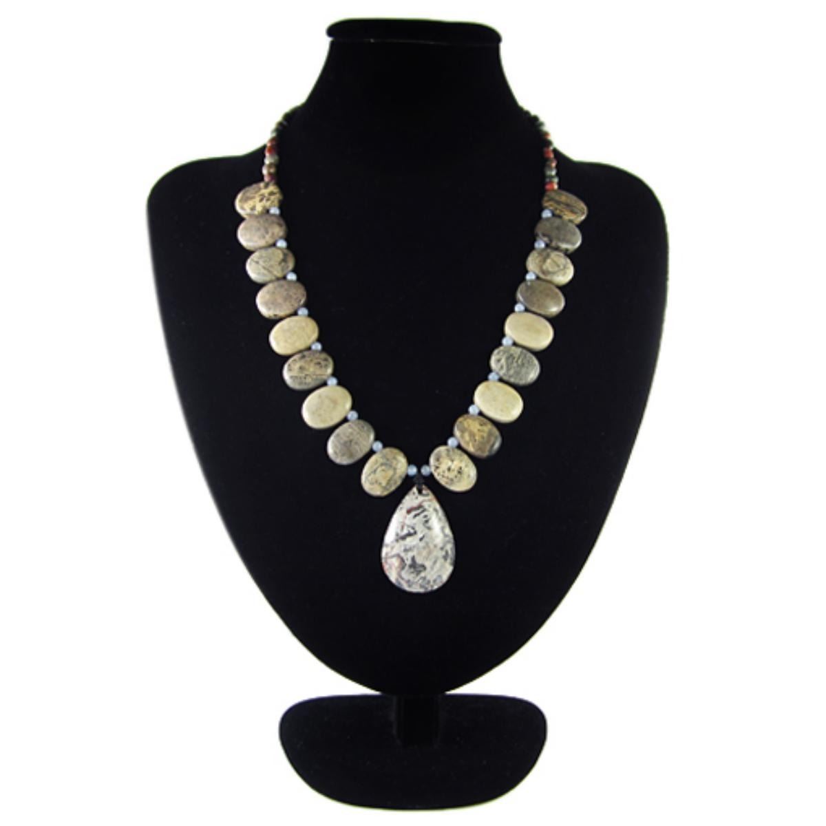 Stone Name Brush Painting *Stone Overall Dimension for each bead 41x28x7 mm (1.614x1.102x0.276 inch ) *Weight 425 ct/ 85 g/ 2.99829 ozOther Stones used in this Necklace Chinese Painting Jasper*Center Stone Properties *Locality China *Appearance opaque *Color white and black *Mohs Hardness 6.5 *Source Natural *Treatments None *Drilled YES diameter 2.5/36-3/36 inch *Other Names~~~~~~~~~(+) Each step of our Lapidary work is under tight quality control . With the best pattern-color combination possible in mind the initial cut was done by experienced lapidary ... The last-step diamond polishing makes the surface of each bead/cab mirror-like glossy that meet the highest standard possible. Finally only those met all quality requirements are selected.