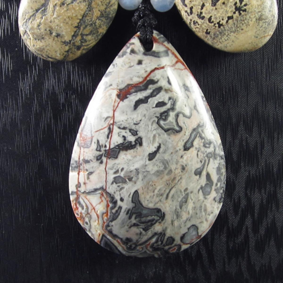 Stone Name Brush Painting *Stone Overall Dimension for each bead 41x28x7 mm (1.614x1.102x0.276 inch ) *Weight 425 ct/ 85 g/ 2.99829 ozOther Stones used in this Necklace Chinese Painting Jasper*Center Stone Properties *Locality China *Appearance opaque *Color white and black *Mohs Hardness 6.5 *Source Natural *Treatments None *Drilled YES diameter 2.5/36-3/36 inch *Other Names~~~~~~~~~(+) Each step of our Lapidary work is under tight quality control . With the best pattern-color combination possible in mind the initial cut was done by experienced lapidary ... The last-step diamond polishing makes the surface of each bead/cab mirror-like glossy that meet the highest standard possible. Finally only those met all quality requirements are selected.