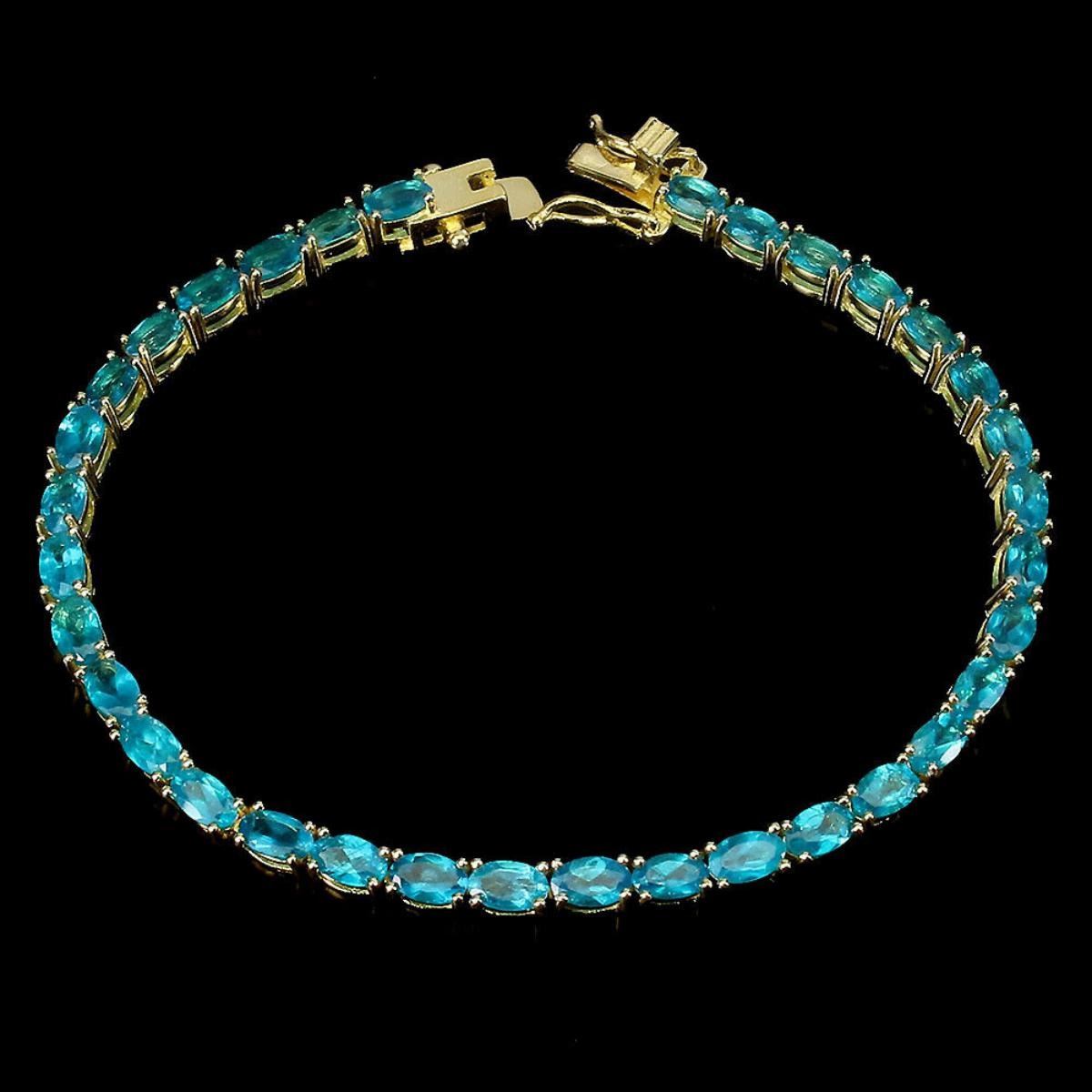925 STERLING SILVER;PLATE-14K YELLOW GOLD;LENGTH (INCHES)7.5;MAIN STONE-APATITE;TOTAL WEIGHT-9.06 GRAM (TOTAL WEIGHT OF SILVER + STONE)DIMENSION-* STONE 5.0 X 3.0 MM.;* TOTAL LENGTH- 7.5 INCHES.;* FACE BRACELET -175.0 X 3.0 MM.;MAIN STONE SHAPE-OVAL CUT;MAIN STONE COLOR-PARAIBA BLUE;CLARITY/GRADE-IF TO VVS;TREATMENT-UNHEATED;ORIGIN- BRAZIL;HARDNESS-5;
