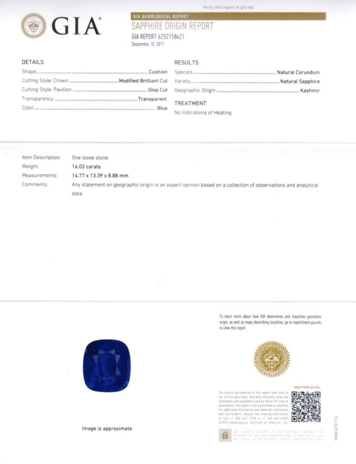 Natural Stunning Rare Kashmir Sapphire 16.02 Cts........Top Enchanting blue color...GIA Certified with special report from GIA.......completely natural.....not enhanced in any way....Origin - Kashmir ( Please Note - Ring is not included ) Video is available upon request.
