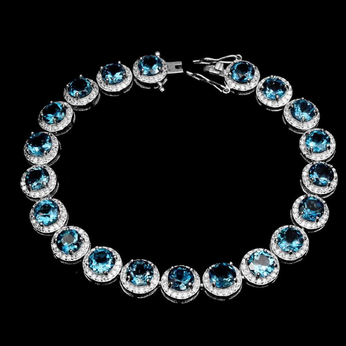 925 STERLING SILVER;; PLATE -14K WHITE GOLD; LENGTH (INCHES) 7.5; MAIN STONE -LONDON BLUE TOPAZ; OTHER GEMS -CUBIC ZIRCONIA; TOTAL WEIGHT -86.94 CT (TOTAL WEIGHT OF SILVER + STONE) DIMENSION * STONE 6.0 MM. * CZ 1.0 MM. * FACE BRACELET 185.0 X 9.0 MM.; MAIN STONE SHAPE -ROUND CUT; MAIN STONE COLOR -TOP LONDON BLUE; CLARITY/GRADE -IF TO VVS; LUSTER -ATTRACTIVE; TREATMENT -HEATED; ORIGIN -AFRICA; HARDNESS -8