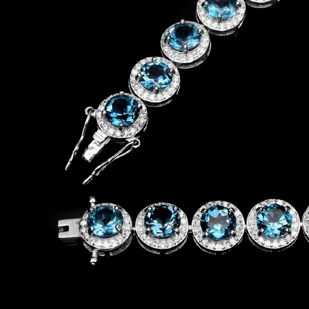 925 STERLING SILVER;; PLATE -14K WHITE GOLD; LENGTH (INCHES) 7.5; MAIN STONE -LONDON BLUE TOPAZ; OTHER GEMS -CUBIC ZIRCONIA; TOTAL WEIGHT -86.94 CT (TOTAL WEIGHT OF SILVER + STONE) DIMENSION * STONE 6.0 MM. * CZ 1.0 MM. * FACE BRACELET 185.0 X 9.0 MM.; MAIN STONE SHAPE -ROUND CUT; MAIN STONE COLOR -TOP LONDON BLUE; CLARITY/GRADE -IF TO VVS; LUSTER -ATTRACTIVE; TREATMENT -HEATED; ORIGIN -AFRICA; HARDNESS -8