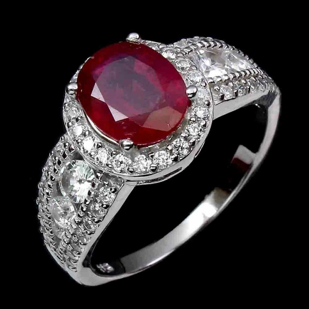 925 STERLING SILVER;PLATE-14K WHITE GOLD;RING SIZE(RESIZABLE)-8;MAIN STONE-RUBY;TOTAL WEIGHT-4.25 GRAM (TOTAL WEIGHT OF SILVER + STONE);DIMENSION-* STONE 9.0 X 7.0 MM. * CZ 1.5 TO 3.0 MM. * RING SIZE 8.0 * FACE RING 11.0 X 10.0 MM.;MAIN STONE SHAPE-OVAL CUT;MAIN STONE COLOR- BLOOD RED;TREATMENT-YES;ORIGIN-MADAGASCAR;HARDNESS-9;