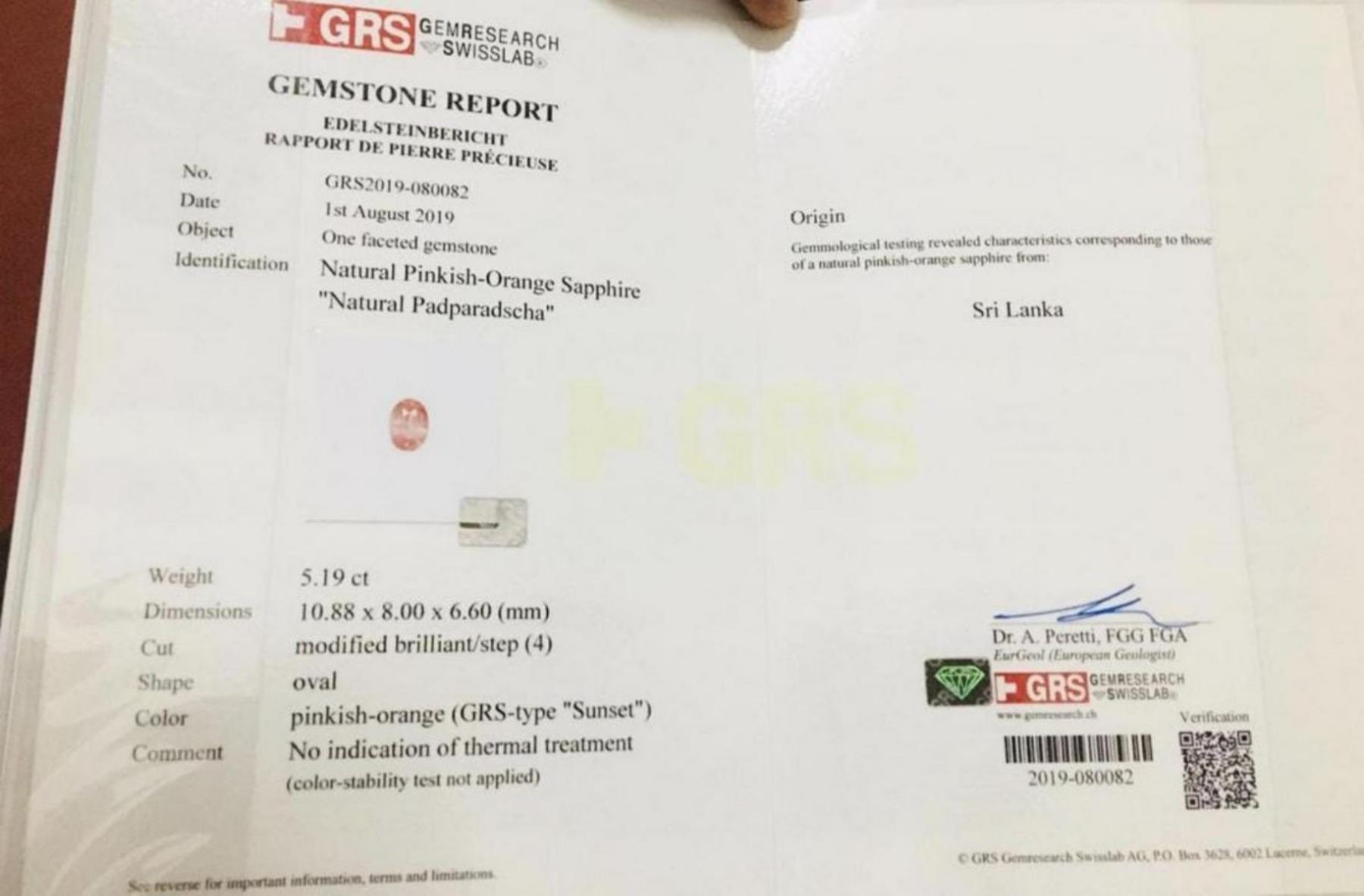 Natural SunSet Padparadscha 5.06 Carats - GRS Certified.....This sapphire was recut from its original weight which was 5.19 to 5.06 Carats to get better clarity.....both certificates are attached. Completely eye clean...completely untreated, Origin - Sri Lanka.