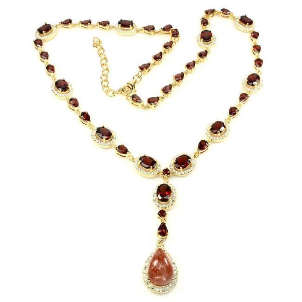 925 STERLING SILVER;PLATE....14K YELLOW GOLD;.....LENGTH (INCHES)20;MAIN STONESUNSTONE;OTHER GEMSCUBIC ZIRCONIA,MOZAMBIQUE GARNETTOTAL WEIGHT164.59 CT (TOTAL WEIGHT OF SILVER + STONE)DIMENSION* STONE 3.0 TO 14.0 X 10.0 MM. * CZ 1.5 MM. * STONES PART LENGTH 440.0 X 55.0 MM.MAIN STONE SHAPEPEAR CABOCHONMAIN STONE COLOR TOP GOLDEN ; CLARITY/GRADE TRANSPARENT LUSTER LUXURIOUS TREATMENT UNHEATED ORIGIN TANZANIA - AFRICA HARDNESS7.0 - 8.0