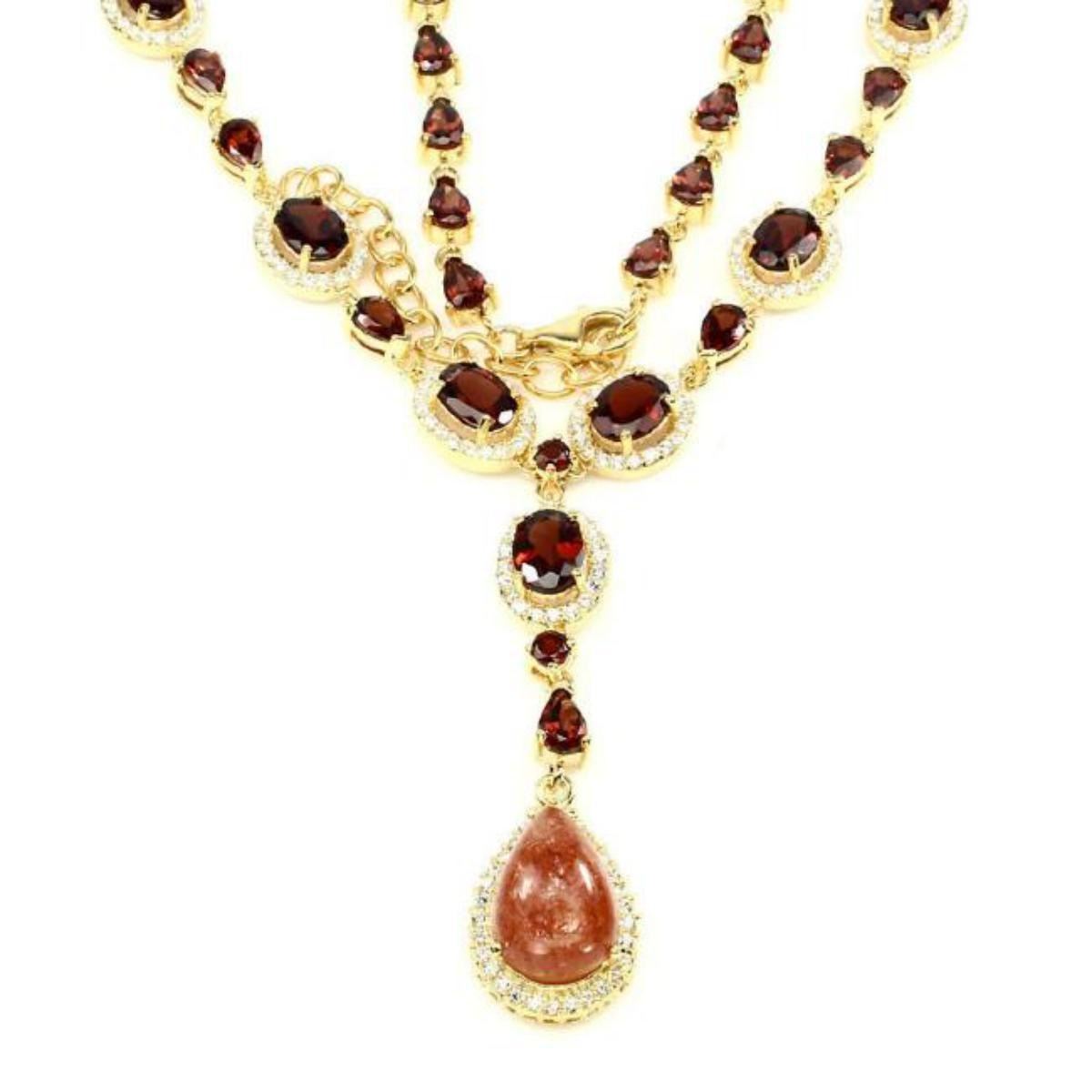 925 STERLING SILVER;PLATE....14K YELLOW GOLD;.....LENGTH (INCHES)20;MAIN STONESUNSTONE;OTHER GEMSCUBIC ZIRCONIA,MOZAMBIQUE GARNETTOTAL WEIGHT164.59 CT (TOTAL WEIGHT OF SILVER + STONE)DIMENSION* STONE 3.0 TO 14.0 X 10.0 MM. * CZ 1.5 MM. * STONES PART LENGTH 440.0 X 55.0 MM.MAIN STONE SHAPEPEAR CABOCHONMAIN STONE COLOR TOP GOLDEN ; CLARITY/GRADE TRANSPARENT LUSTER LUXURIOUS TREATMENT UNHEATED ORIGIN TANZANIA - AFRICA HARDNESS7.0 - 8.0