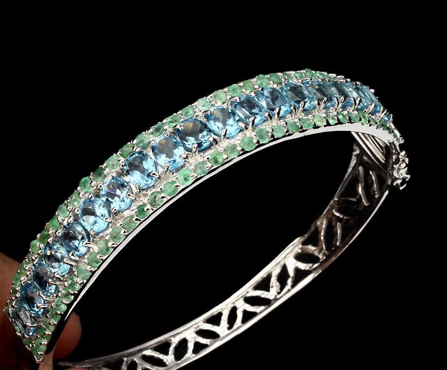925 STERLING SILVER........PLATE.....14K WHITE GOLD.......LENGTH (INCHES)2.3.MAIN STONE....SWISS BLUE TOPAZ.OTHER GEMSEMERALD;TOTAL WEIGHT..97.39 CT (TOTAL WEIGHT OF SILVER + STONE)DIMENSION* STONE 2.0 TO 5.0 X 4.0 MM. * DIAMETER 2.3 INCHES. * FACE BANGLE 62.0 X 11.0 MM.MAIN STONE SHAPEOVAL CUTMAIN STONE COLORTOP SWISS BLUECLARITY/GRADEIF TO VVSLUSTERPRECIOUSTREATMENTHEATEDORIGINAFRICAHARDNESS7.5 - 8.0