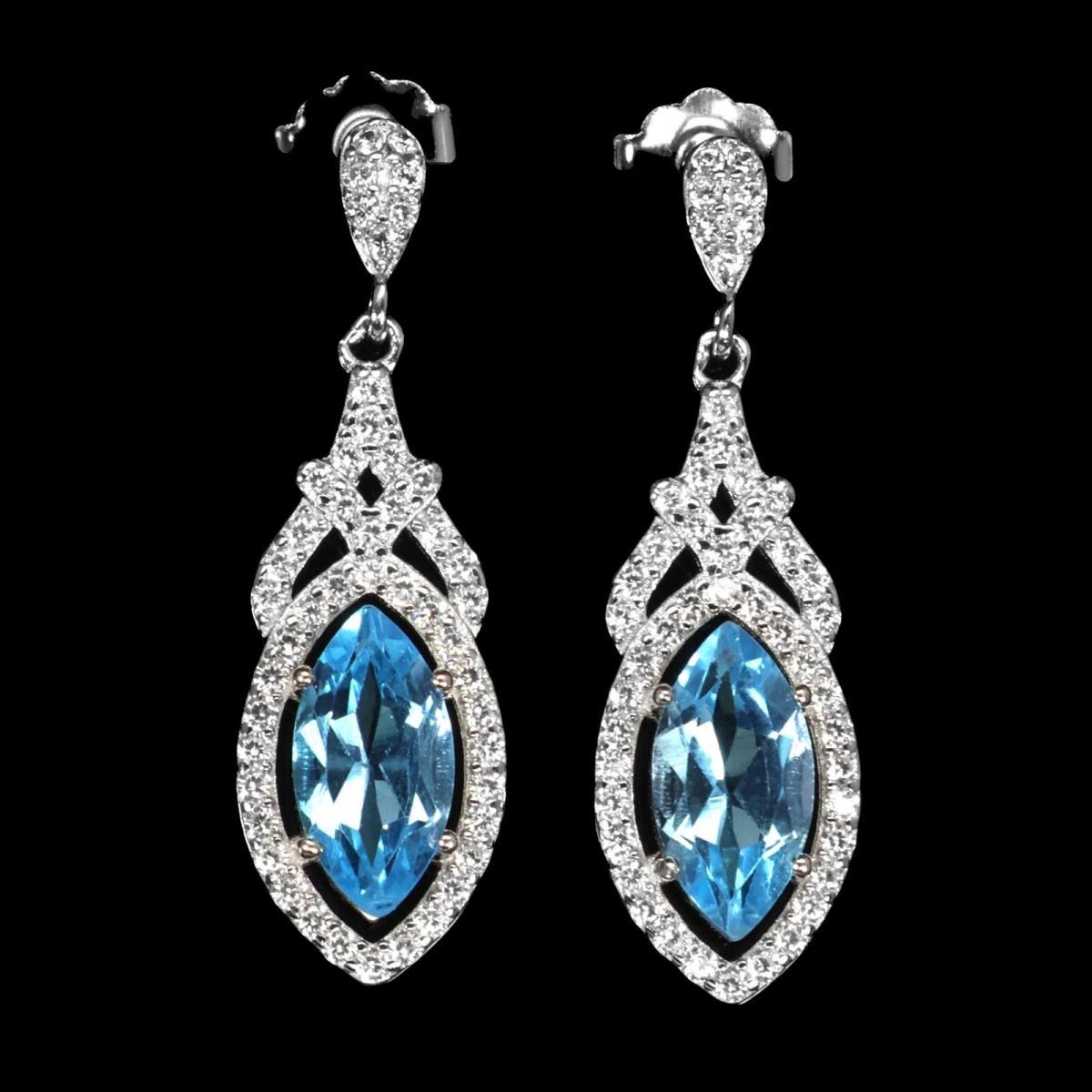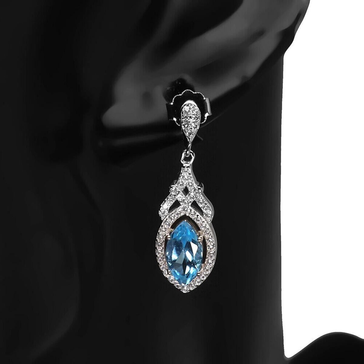 925 STERLING SILVER;PLATE-14K WHITE GOLD;MAIN STONE-SWISS BLUE TOPAZ;TOTAL WEIGHT-3.29 GRAM (TOTAL WEIGHT OF SILVER + STONE);DIMENSION-* STONE 10.0 X 5.0 MM.* FACE EARRINGS 28.0 X 9.0 MM.;MAIN STONE SHAPE-MARQUISE CUT;MAIN STONE COLOR-SWISS BLUE;CLARITY/GRADE-IF TO VVS;TREATMENT-IRRADIATED;ORIGIN-AFRICA;HARDNESS-8.0;