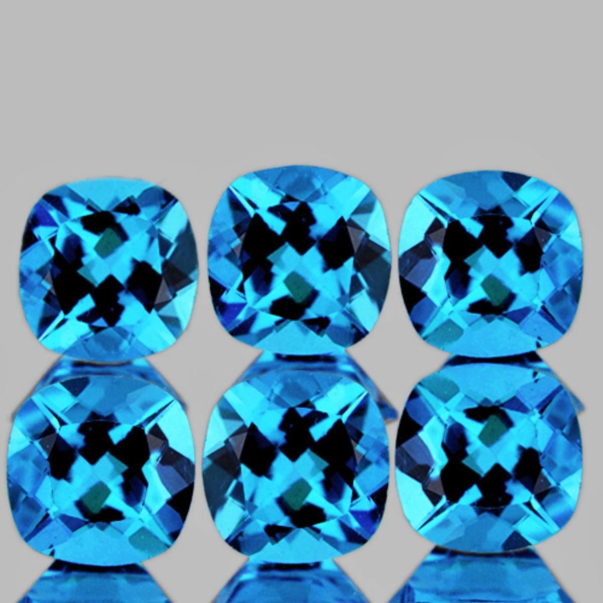 Natural Swiss Blue Topaz; WEIGHT ; : 4.42 cts; SHAPE : Cushion; SIZE ( L x W x D ) : 5.00 mm; QUANTITY : 6 pieces (Perfctly Matched Set) COLOR : Swiss Blue; CLARITY : Flawless-VVS1; ORIGIN : Brazil; HARDNESS : 8; LUSTER : Best Sparkling!!! TREATMENT : Heated;