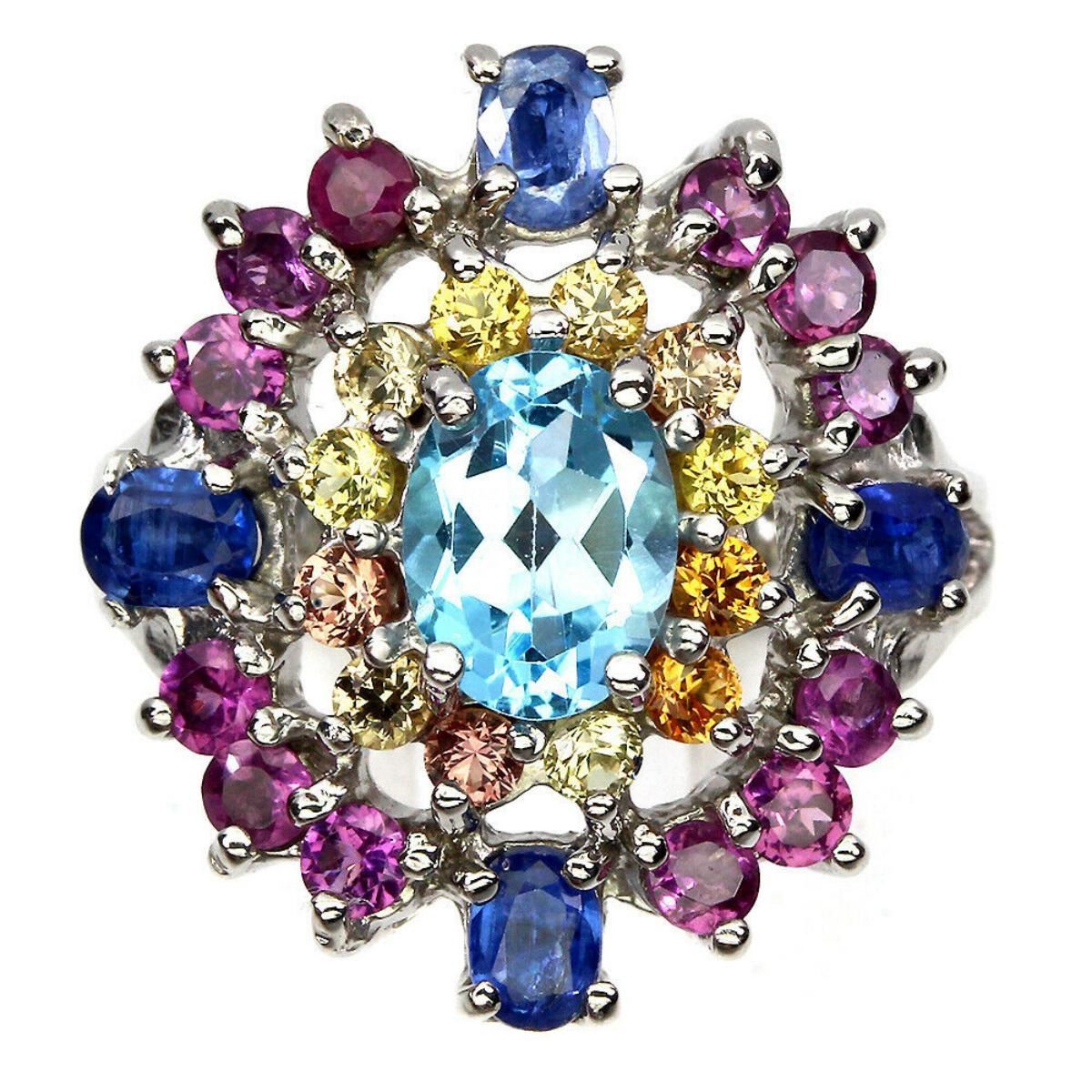 925 STERLING SILVER;PLATE-14K WHITE GOLD;RING SIZE-7(RESIZABLE);MAIN STONE-SWISS BLUE TOPAZ;OTHER GEMS-KYANITE, RHODOLITE GARNET, SAPPHIRE;TOTAL WEIGHT-7.83 GRAM (TOTAL WEIGHT OF SILVER + STONE);DIMENSION-* STONE 2.0 TO 8.0 X 6.0 MM. * RING SIZE 7.0 * FACE RING 22.0 X 20.0 MM.;MAIN STONE SHAPE-OVAL CUT;MAIN STONE COLOR-SWISS BLUE;CLARITY/GRADE-IF;TREATMENT-HEATED;ORIGIN-AFRICA;HARDNESS-8;