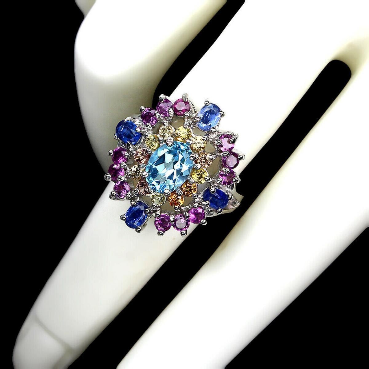 925 STERLING SILVER;PLATE-14K WHITE GOLD;RING SIZE-7(RESIZABLE);MAIN STONE-SWISS BLUE TOPAZ;OTHER GEMS-KYANITE, RHODOLITE GARNET, SAPPHIRE;TOTAL WEIGHT-7.83 GRAM (TOTAL WEIGHT OF SILVER + STONE);DIMENSION-* STONE 2.0 TO 8.0 X 6.0 MM. * RING SIZE 7.0 * FACE RING 22.0 X 20.0 MM.;MAIN STONE SHAPE-OVAL CUT;MAIN STONE COLOR-SWISS BLUE;CLARITY/GRADE-IF;TREATMENT-HEATED;ORIGIN-AFRICA;HARDNESS-8;