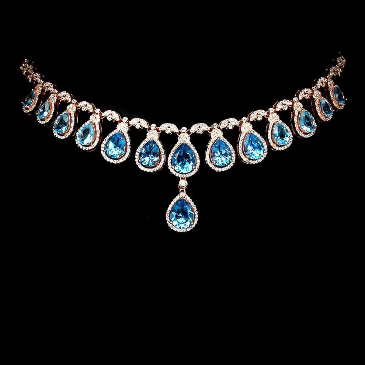 925 STERLING SILVER;PLATE-14K ROSE GOLD;LENGTH (INCHES)-18.5;MAIN STONE-SWISS BLUE TOPAZ;TOTAL WEIGHT-40.79 GRAM (TOTAL WEIGHT OF SILVER + STONE);DIMENSION-* STONE 7.0 X 5.0 TO 10.0 X 8.0 MM.* TOTAL LENGTH 18.5 INCHES.* STONES PART LENGTH 440.0 X 36.0 MM.;MAIN STONE SHAPE-PEAR;MAIN STONE COLOR-SWISS BLUE;CLARITY/GRADE-IF TO VVS;TREATMENT-IRRADIATED;ORIGIN-AFRICA;HARDNESS-8;