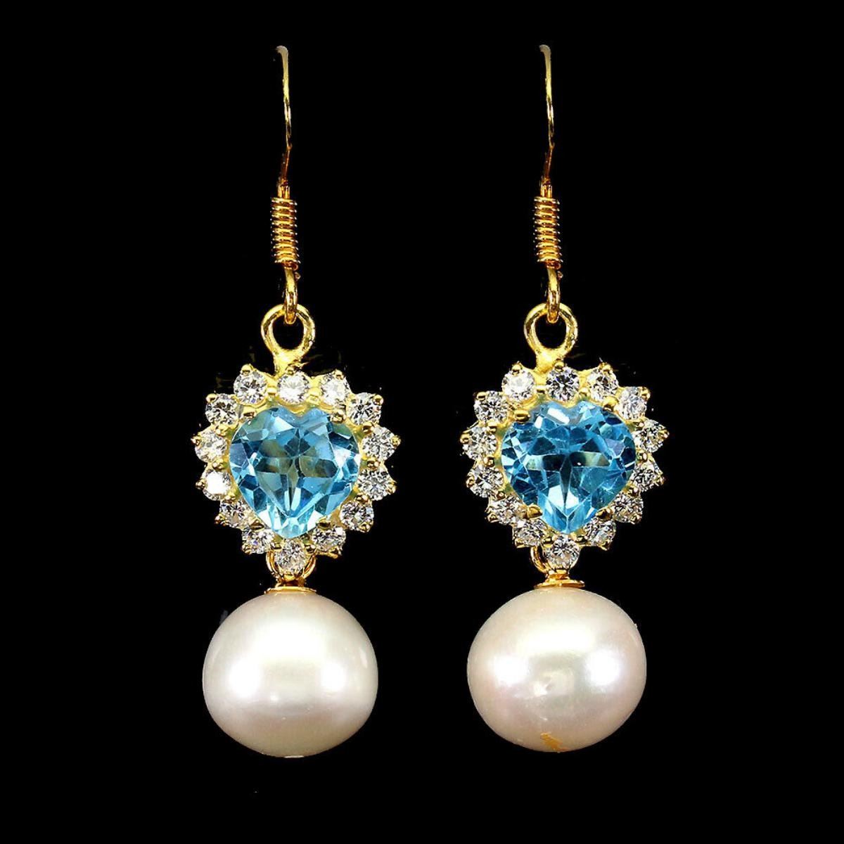 925 STERLING SILVER;PLATE-14K YELLOW GOLD;MAIN STONE-SWISS BLUE TOPAZ;OTHER GEMS-- PEARL;TOTAL WEIGHT-7.3 GRAM (TOTAL WEIGHT OF SILVER + STONE)DIMENSION-* STONE 8.0 MM. * PEARL 11.0 X 10.0 MM. * CZ 2.0 MM. * FACE EARRINGS- 41.0 X 13.0 MM.;MAIN STONE SHAPE-HEART CUT;MAIN STONE COLOR-SWISS BLUE;CLARITY/GRADE-IF TO VVS;TREATMENT-IRRADIATED;ORIGIN-AFRICA;HARDNESS-8;