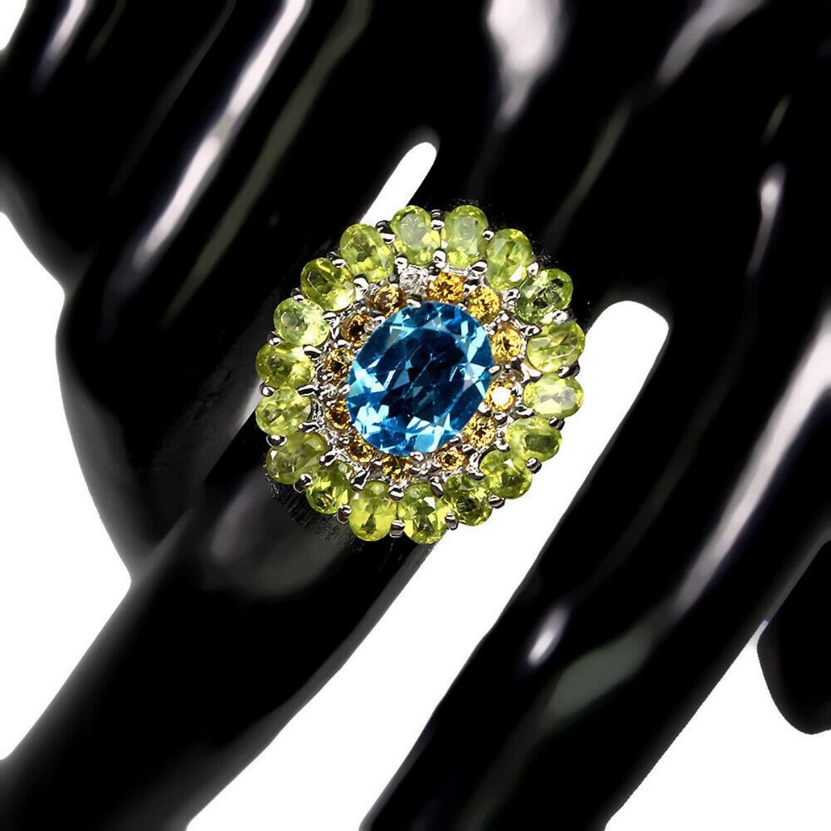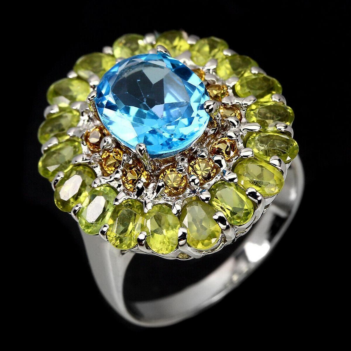 925 STERLING SILVER;PLATE-14K WHITE GOLD;RING SIZE-8(RESIZABLE);MAIN STONE-SWISS BLUE TOPAZ;OTHER GEMS-PERIDOT, SAPPHIRE DIAMOND CUT;TOTAL WEIGHT-6.87 GRAM (TOTAL WEIGHT OF SILVER + STONE);DIMENSION-* STONE 2.0 TO 10.0 X 8.0 MM. * RING SIZE 8.0 * FACE RING 22.0 X 20.0 MM.;MAIN STONE SHAPE-OVAL CUT;MAIN STONE COLOR- SWISS BLUE;CLARITY/GRADE-IF;TREATMENT-HEATED;ORIGIN-AFRICA;HARDNESS-8;