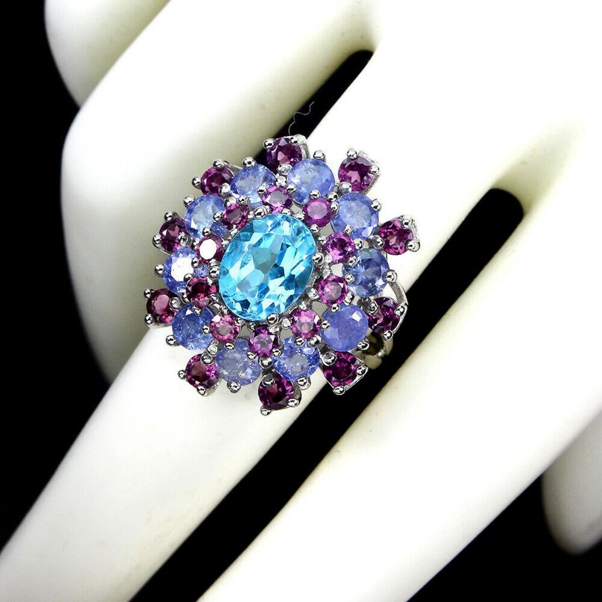 925 STERLING SILVER;PLATE-14K WHITE GOLD;RING SIZE-8 (RESIZABLE);MAIN STONE-SWISS BLUE TOPAZ;OTHER GEMS-RHODOLITE GARNET, TANZANITE;TOTAL WEIGHT-8.29 GRAM (TOTAL WEIGHT OF SILVER + STONE);DIMENSION-* STONE 2.0 TO 9.0 X 7.0 MM. * RING SIZE 8.0 * FACE RING 25.0 X 22.0 MM.;MAIN STONE SHAPE-OVAL CUT;MAIN STONE COLOR- SWISS BLUE;CLARITY/GRADE-IF TO VVS;ORIGIN-AFRICA;HARDNESS-8;