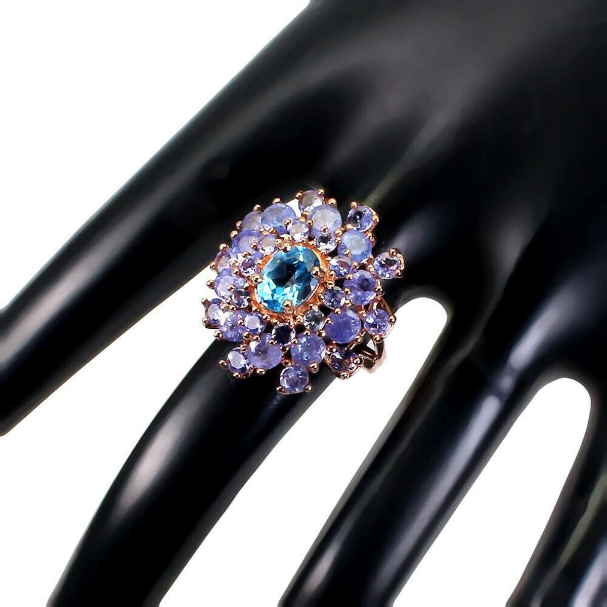 925 STERLING SILVER;PLATE-14K ROSE GOLD;RING SIZE-8(RESIZABLE);MAIN STONE-SWISS BLUE TOPAZ;OTHER GEMS-TANZANITE;TOTAL WEIGHT-7.6 GRAM (TOTAL WEIGHT OF SILVER + STONE);DIMENSION-* STONE 2.5 TO 8.0 X 6.0 MM. * RING SIZE 8.0 * FACE RING 25.0 X 22.0 MM.;MAIN STONE SHAPE-OVAL CUT;MAIN STONE COLOR-SWISS BLUE;CLARITY/GRADE-IF;TREATMENT-HEATED;ORIGIN-AFRICA;HARDNESS-8;