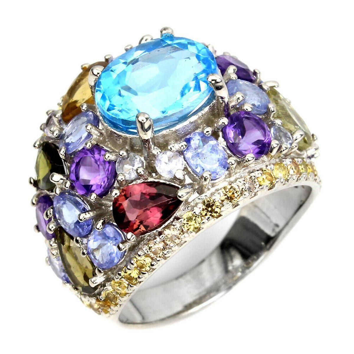 925 STERLING SILVER;PLATE-14K WHITE GOLD;RING SIZE(resizeable)8;MAIN STONE-SWISS BLUE TOPAZ;OTHER GEMS-SAPPHIRE, TANZANITE, TOURMALINE;TOTAL WEIGHT-8.85 GRAM (TOTAL WEIGHT OF SILVER + STONE)DIMENSION-* STONE 1.5 TO 10.0 X 8.0 MM. * RING SIZE 8.0 * FACE RING- 23.0 X 19.0 MM.;MAIN STONE SHAPE-OVAL CUT;MAIN STONE COLOR- SWISS BLUE;CLARITY/GRADE-IF TO VVS;ORIGIN-AFRICA;
