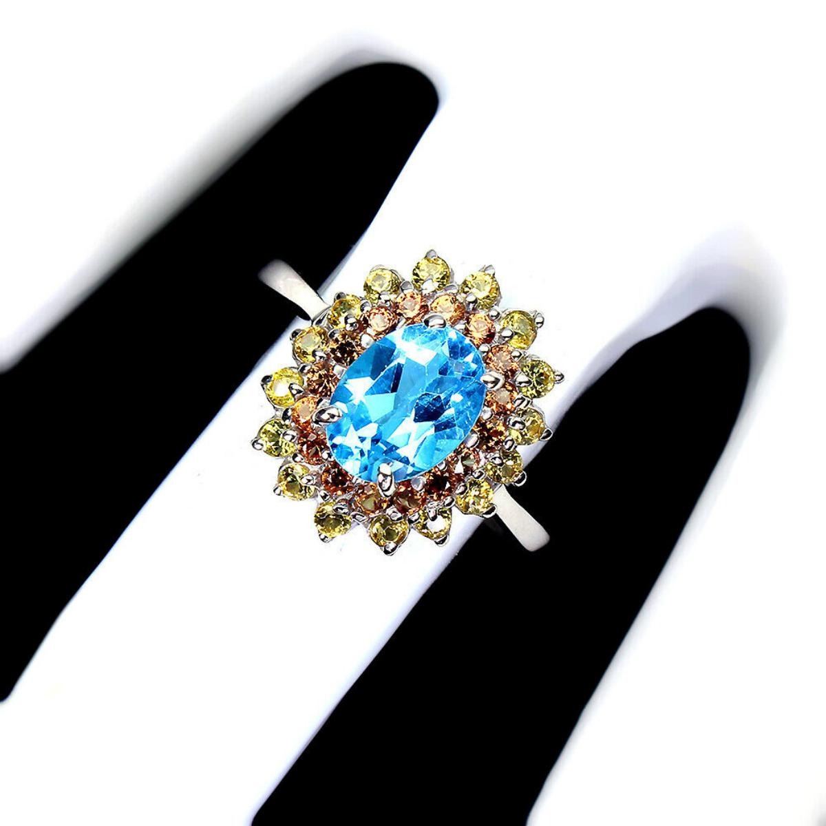 925 STERLING SILVER;PLATE-14K WHITE GOLD;RING SIZE-8(RESIZABLE);MAIN STONE-SWISS TOPAZ;OTHER GEMS-SAPPHIRE;TOTAL WEIGHT-3.36 GRAM (TOTAL WEIGHT OF SILVER + STONE);DIMENSION-* STONE 1.5 TO 8.0 X 6.0 MM.* RING SIZE 8.0* FACE RING 15.0 X 13.0 MM.;MAIN STONE SHAPE-OVAL CUT;MAIN STONE COLOR-SWISS BLUE;CLARITY/GRADE-IF TO VVS;TREATMENT-HEATED;ORIGIN-AFRICA;HARDNESS-8.0;