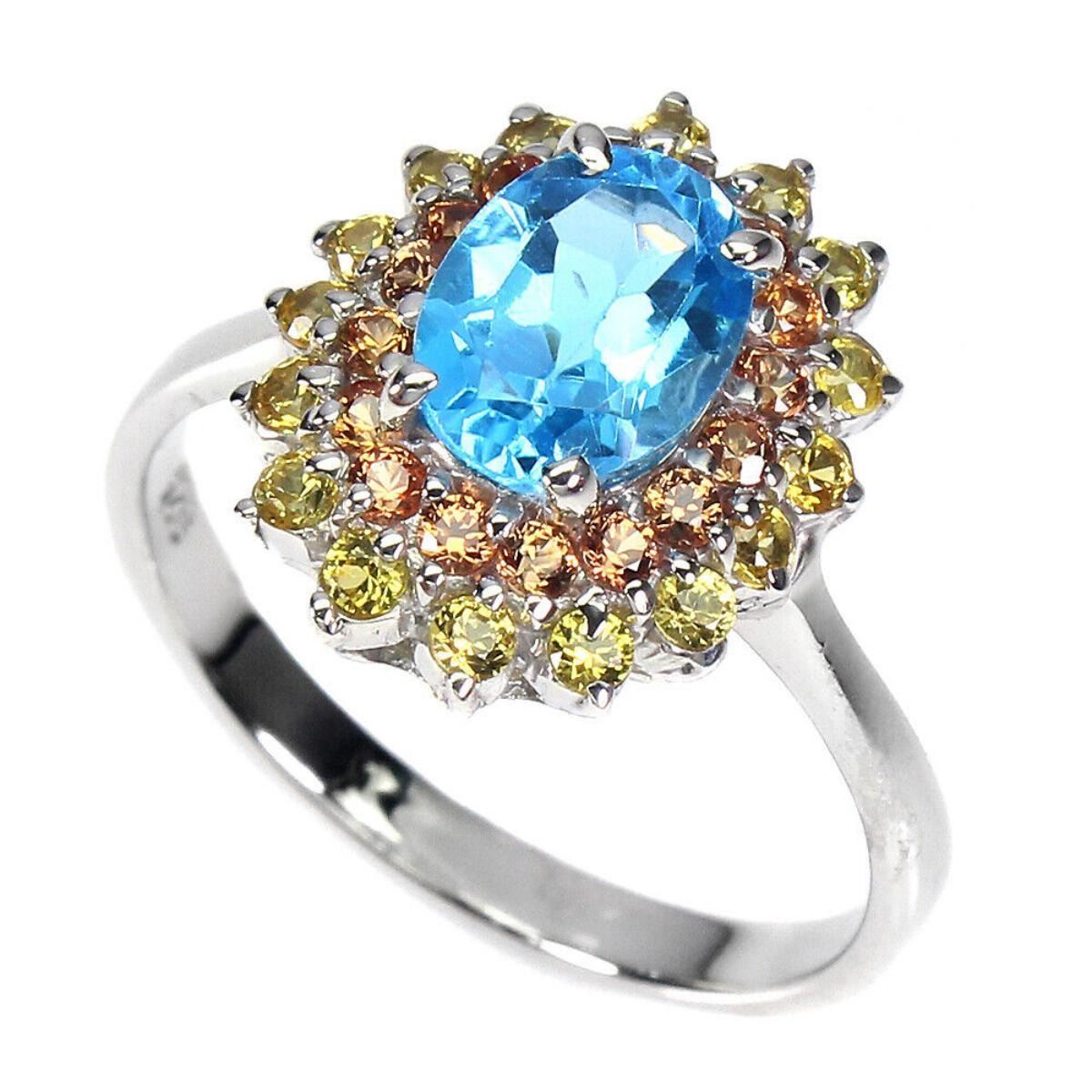 925 STERLING SILVER;PLATE-14K WHITE GOLD;RING SIZE-8(RESIZABLE);MAIN STONE-SWISS TOPAZ;OTHER GEMS-SAPPHIRE;TOTAL WEIGHT-3.36 GRAM (TOTAL WEIGHT OF SILVER + STONE);DIMENSION-* STONE 1.5 TO 8.0 X 6.0 MM.* RING SIZE 8.0* FACE RING 15.0 X 13.0 MM.;MAIN STONE SHAPE-OVAL CUT;MAIN STONE COLOR-SWISS BLUE;CLARITY/GRADE-IF TO VVS;TREATMENT-HEATED;ORIGIN-AFRICA;HARDNESS-8.0;