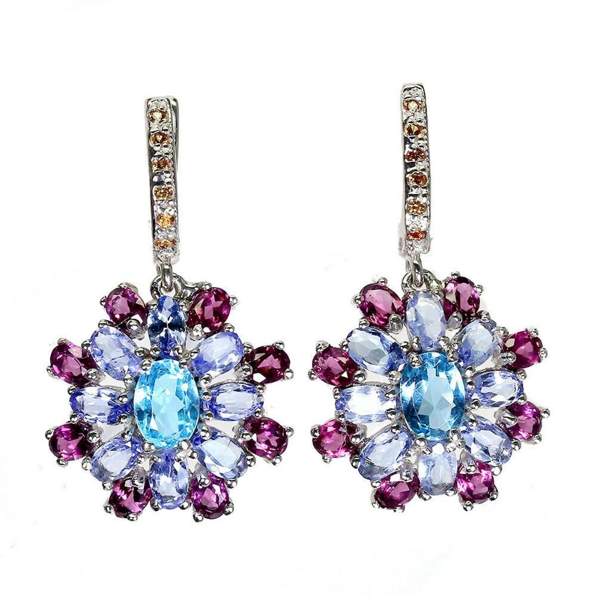 925 STERLING SILVER;PLATE-14K WHITE GOLD;MAIN STONE-SWISS BLUE TOPAZ;OTHER GEMS-RHODOLITE GARNET, TANZANITE, SAPPHIRE ;TOTAL WEIGHT-6.91 GRAM (TOTAL WEIGHT OF SILVER + STONE)DIMENSION-* STONE 1.0 TO 7.0 X 5.0 MM.;;* FACE EARRINGS- 34.0 X 20.0 MM.;MAIN STONE SHAPE-OVAL CUT;MAIN STONE COLOR - SWISS BLUE;CLARITY/GRADE-IF;ORIGIN-AFRICA;HARDNESS-8;