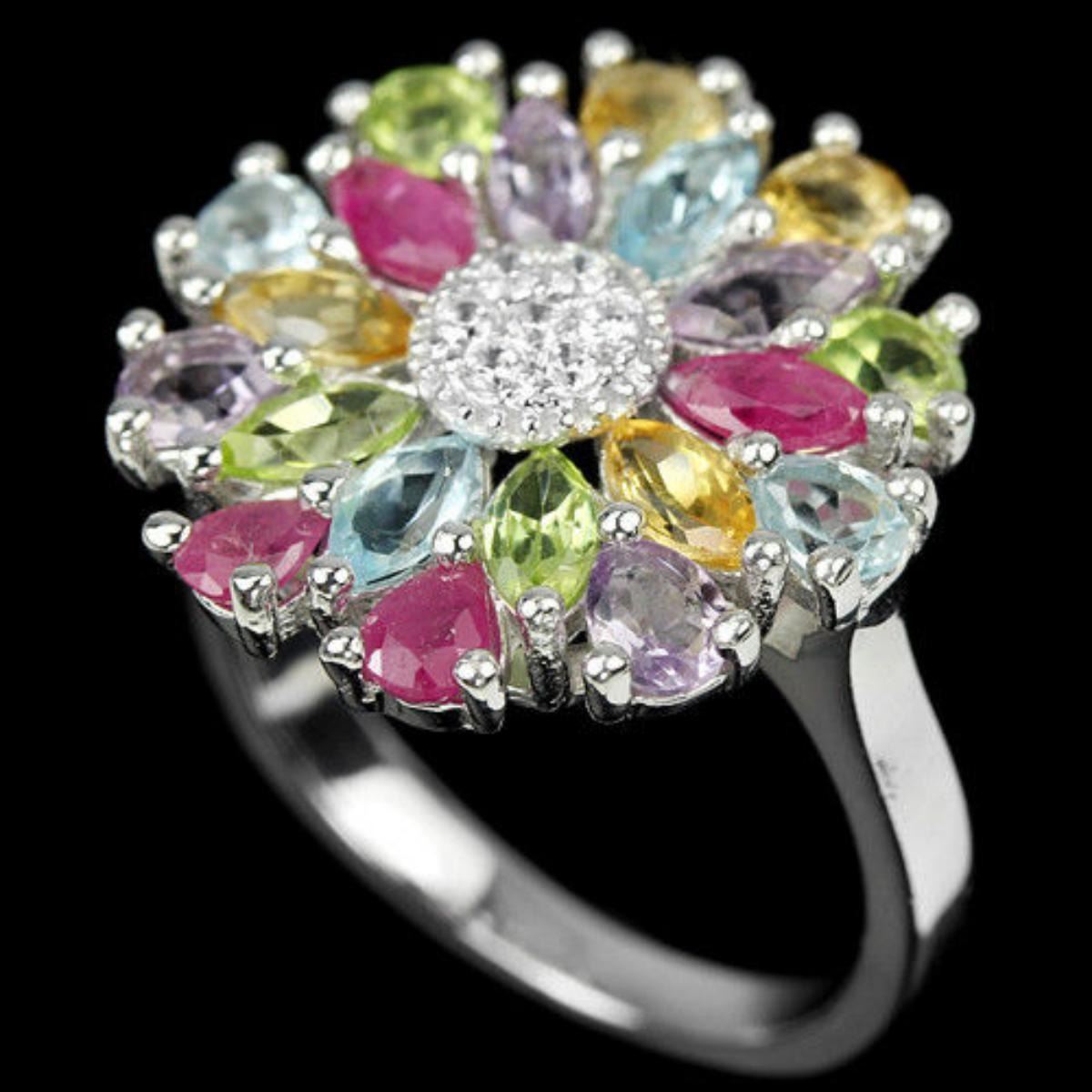REAL TOPAZ RUBY AMETHYST CITRINE & CZ 925 SILVER RING 14K WHITE GOLD COATING; RING SIZE8.00 ( can be resized )ITEM QUANTITY1STONE SHAPEMARQUISE & PEARSTONE DIMENSION6 X 3 MM. & 4 X 3 MM.ITEM WEIGHT5.3 GRAMCOLORMULTI COLORCLARITYIF - VVSLUSTERDAZZLINGTREATMENTTRANLUCENT, IRRADIATION & UNHEATEDORIGIN OF STONEAFRICA, BRAZIL & ASIAHARDNESS6.5 - 9OTHERFACE OF RING 20 X 20 MM. WHITE CUBIC ZIRCONIA 1.5 MM.