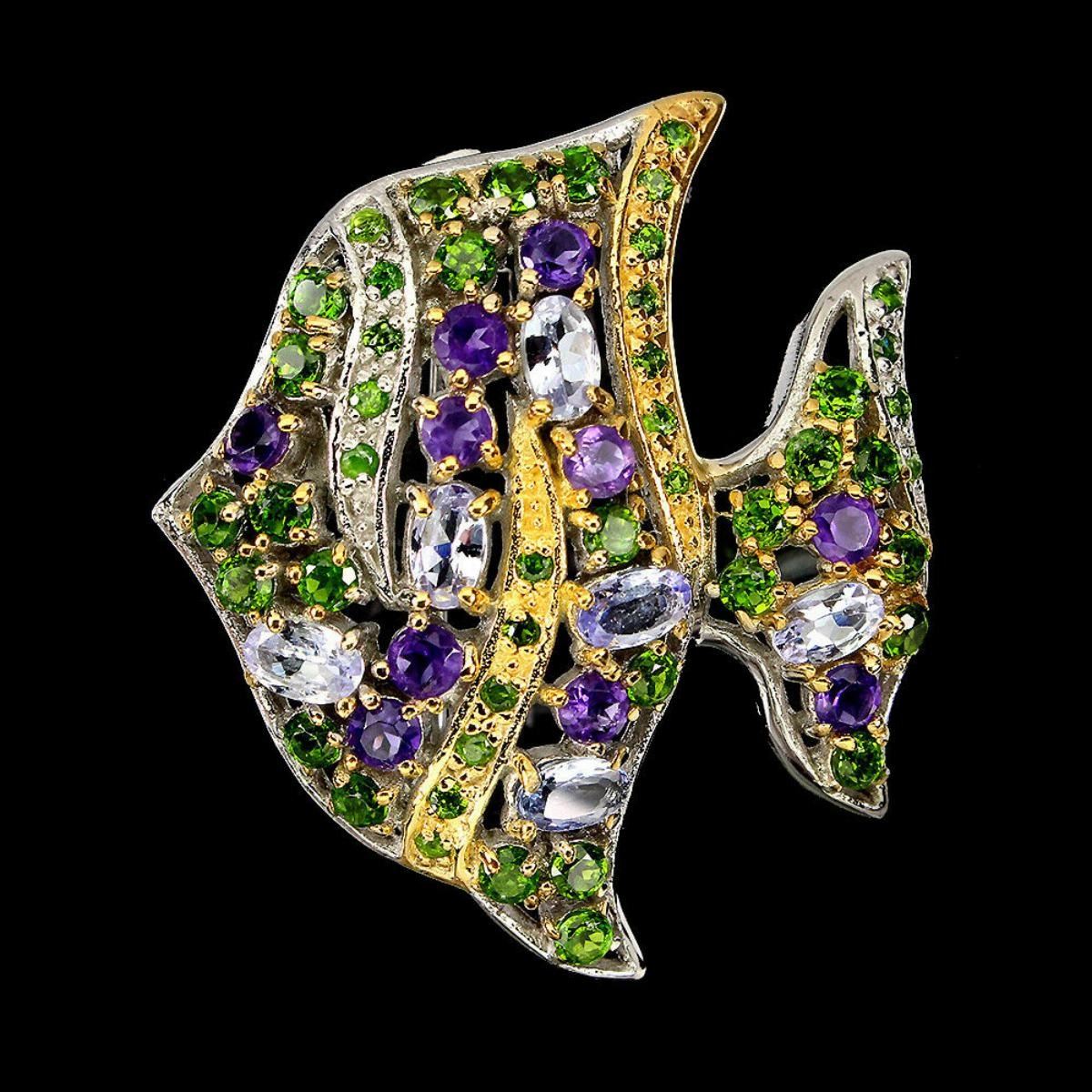925 STERLING SILVER;PLATE-2-TONE WHITE & YELLOW 14K GOLD;MAIN STONE-TANZANITE;OTHER GEMS-AMETHYST, CHROME DIOPSIDE;TOTAL WEIGHT-10.58 GRAM (TOTAL WEIGHT OF SILVER + STONE)DIMENSION-* STONE 1.5 TO 5.0 X 3.0 MM. * FACE BROOCH 38.0 X 33.0 MM.;MAIN STONE SHAPE-OVAL CUT;MAIN STONE COLOR-TOP NICE BLUE VIOLET;CLARITY/GRADE-IF TO VVS;TREATMENT-UNHEATED;ORIGIN-TANZANIA - AFRICA;