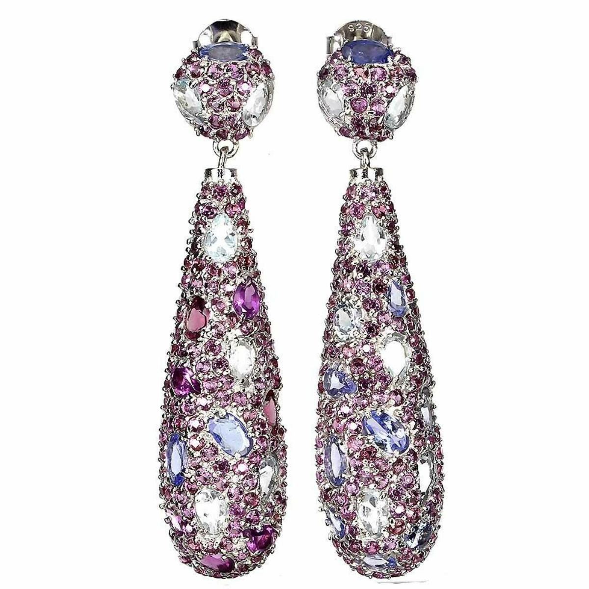 925 STERLING SILVER;PLATE-14K WHITE GOLD;MAIN STONE-TANZANITE;OTHER GEMS-AQUAMARINE, RHODOLITE GARNET;TOTAL WEIGHT-9.02 GRAM (TOTAL WEIGHT OF SILVER + STONE)DIMENSION-* STONE 1.5 TO 5.0 X 3.0 MM. * FACE EARRINGS 52.0 X 13.0 MM.;MAIN STONE SHAPE-OVAL CUT;MAIN STONE COLOR- BLUE VIOLET;CLARITY/GRADE-IF;TREATMENT-UNHEATED;ORIGIN-TANZANIA - AFRICA;HARDNESS-7.0 - 7.5;