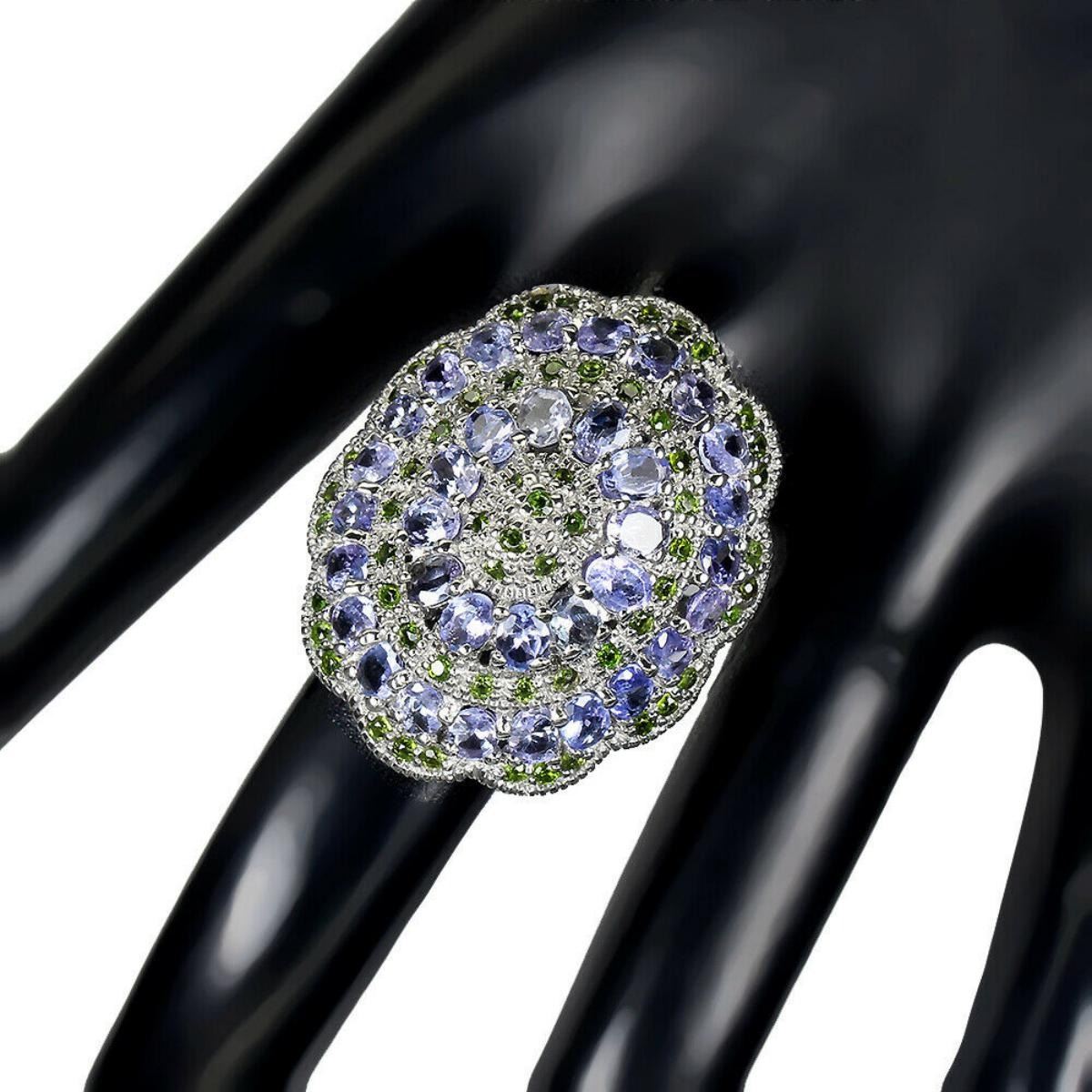 925 STERLING SILVER;PLATE-14K WHITE GOLD;RING SIZE/---(resizeable)9.5MAIN STONE-TANZANITE;OTHER GEMS-CHROME DIOPSIDE;TOTAL WEIGHT-12.21 GRAM (TOTAL WEIGHT OF SILVER + STONE)DIMENSION-* STONE 1.5 TO 4.0 X 3.0 MM. * RING SIZE 9.5 * FACE RING 33.0 X 26.0 MM.;MAIN STONE SHAPE-OVAL CUT;MAIN STONE COLOR-TOP RICH BLUE VIOLET;CLARITY/GRADE-IF TO VVS;LUSTER-GORGEOUS;TREATME-NT-UNHEATED;ORIGINTANZANIA - AFRICA;HARDNESS-7;