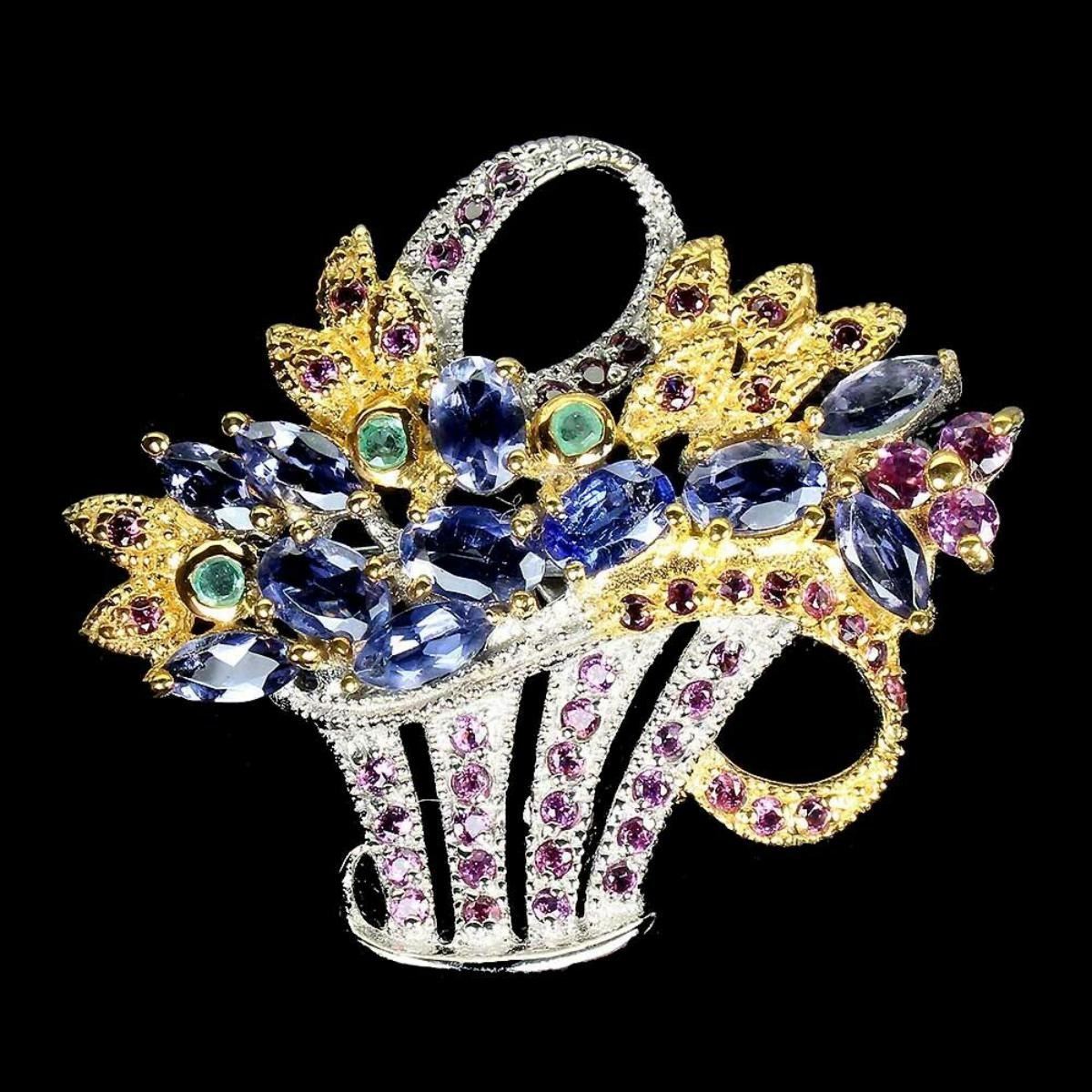 925 STERLING SILVER;PLATE-2-TONE WHITE & YELLOW 14K GOLD;MAIN STONE-TANZANITE;OTHER GEMS-EMERALD, RHODOLITE GARNET;TOTAL WEIGHT-7.31 GRAM (TOTAL WEIGHT OF SILVER + STONE)DIMENSION-* STONE 1.5 TO 6.0 X 4.0 MM. * FACE BROOCH 40.0 X 34.0 MM.;MAIN STONE SHAPE-MARQUISE CUT;MAIN STONE COLOR-TOP NICE BLUE VIOLET;CLARITY/GRADE-IF TO VVS;TREATMENT-UNHEATED;ORIGIN-TANZANIA - AFRICA;HARDNESS-7.0 - 7.5;