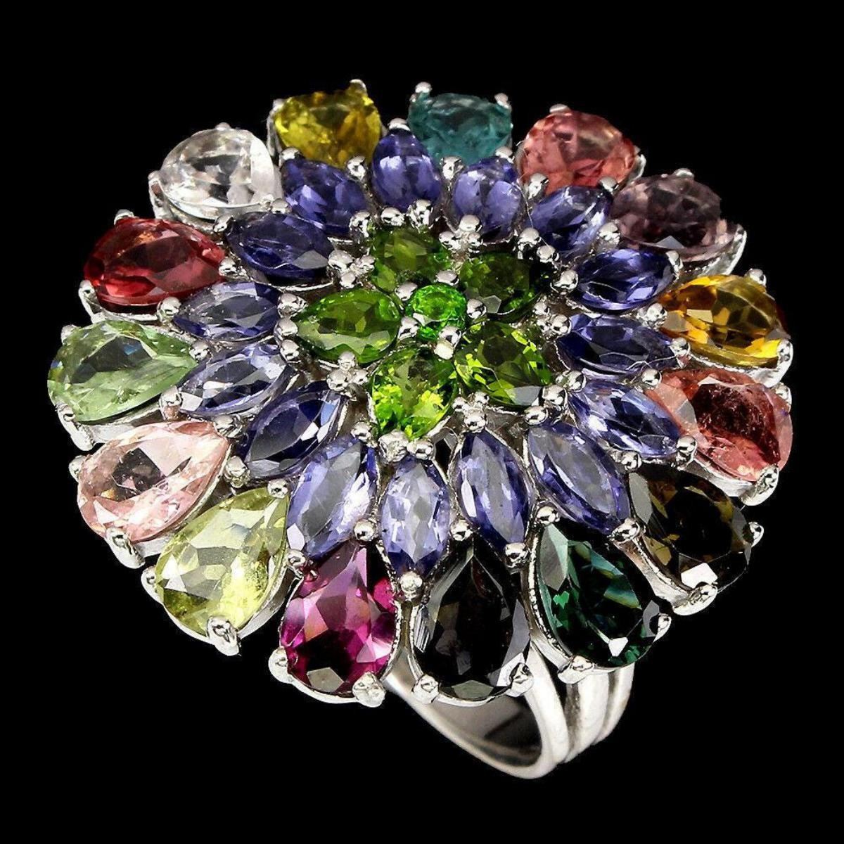 925 STERLING SILVER;PLATE-14K WHITE GOLD;RING SIZE(resizeable)8;MAIN STONE-TOURMALINE;OTHER GEMS-CHROME DIOPSIDE, TANZANITE;TOTAL WEIGHT-9.42 GRAM (TOTAL WEIGHT OF SILVER + STONE)DIMENSION-* STONE 2.0 TO 6.0 X 4.0 MM. * RING SIZE 8.0 * FACE RING- 97.0 X 27.0 MM.;;MAIN STONE SHAPE-PEAR CUT;MAIN STONE COLOR-MULTI-COLOR;CLARITY/GRADE-IF TO VVS;TREATMENT-UNHEATED;ORIGIN-BRAZIL;HARDNESS-7;