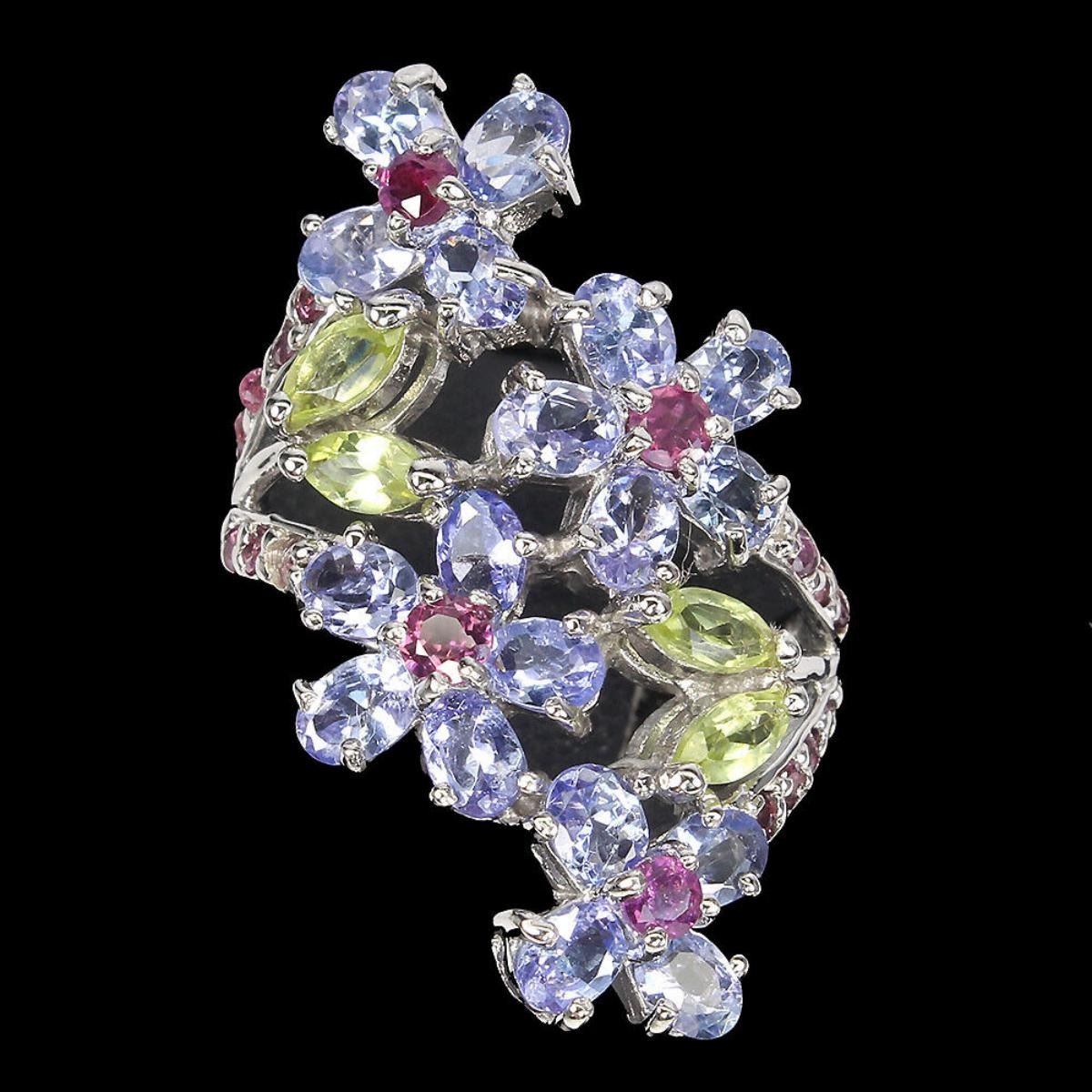 925 STERLING SILVER;PLATE-14K WHITE GOLD;RING SIZE/resizeable-7;MAIN STONE-TANZANITE;OTHER GEMS-PERIDOT, RHODOLITE GARNET;TOTAL WEIGHT-6.43 GRAM (TOTAL WEIGHT OF SILVER + STONE)DIMENSION-* STONE 1.5 TO 5.0 X 2.5 MM. * RING SIZE 7.0 * FACE RING- 32.0 X 21.0 MM.;MAIN STONE SHAPE-OVAL CUT;MAIN STONE COLOR-TOP NICE BLUE VIOLET;CLARITY/GRADE-IF TO VVS;;TREATMENT-UNHEATED;ORIGIN-TANZANIA - AFRICA;HARDNESS-7.0 - 7.5;