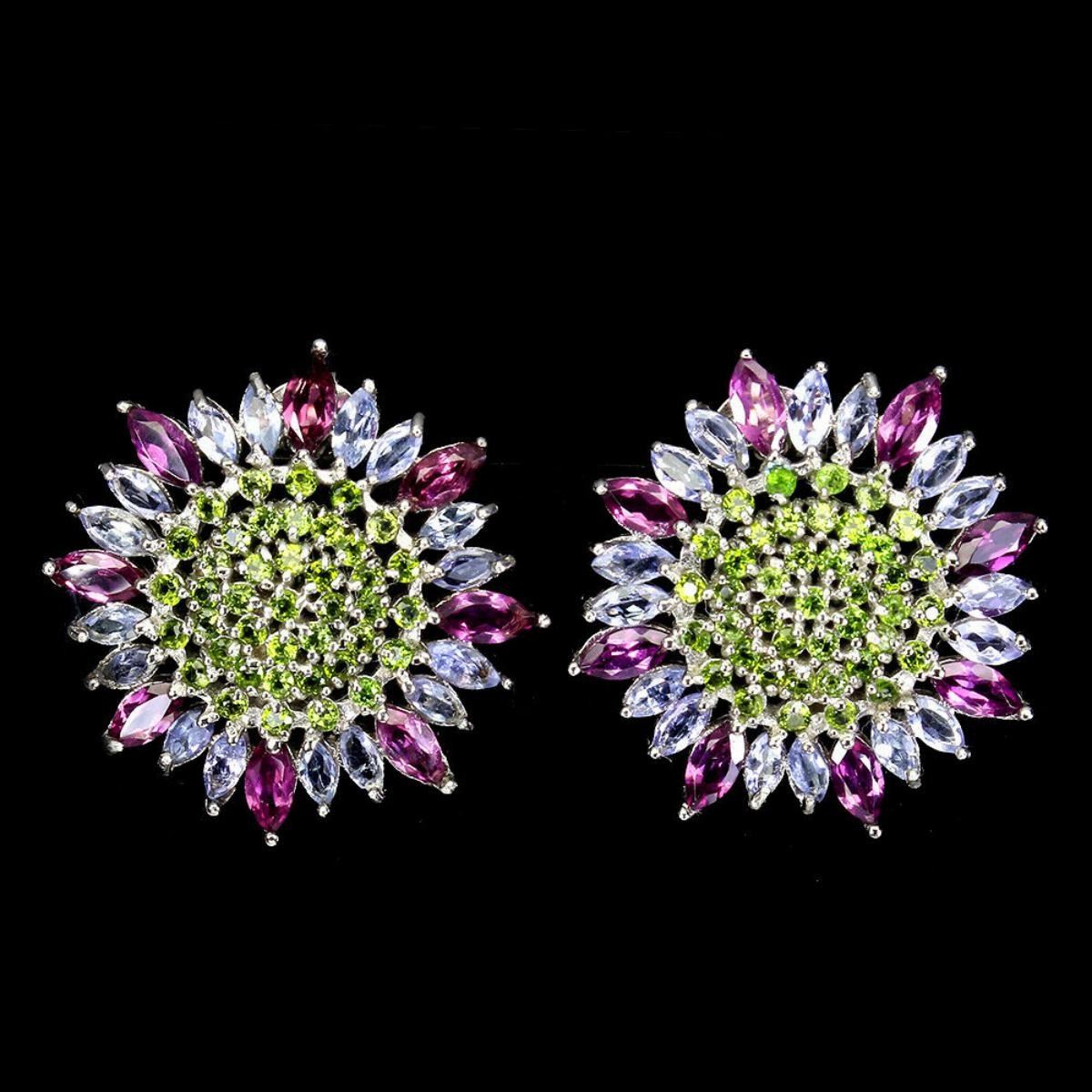 925 STERLING SILVER;PLATE-14K WHITE GOLD;MAIN STONE-RHODOLITE GARNET;OTHER GEMS-CHROME DIOPSIDE, TANZANITE;TOTAL WEIGHT-6.41 GRAM (TOTAL WEIGHT OF SILVER + STONE)DIMENSION-* STONE 1.5 TO 5.0 X 2.5 MM. * FACE EARRINGS 25.0 X 25.0 MM.;MAIN STONE SHAPE-MARQUISE CUT;MAIN STONE COLOR-TOP RICH PINK RASPBERRY;CLARITY/GRADE-IF TO VVS;TREATMENT-UNHEATED;ORIGIN-AFRICA;HARDNESS-7.0 - 7.5;