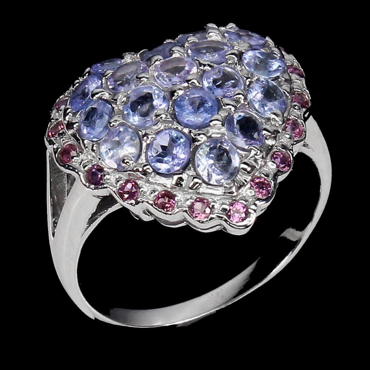 925 STERLING SILVER;PLATE-14K WHITE GOLD;RING SIZE-9(RESIZABLE);MAIN STONE-TANZANITE;OTHER GEMS-RHODOLITE GARNET;TOTAL WEIGHT-4.24 GRAM (TOTAL WEIGHT OF SILVER + STONE);DIMENSION-* STONE 1.5 TO 3.0 MM. * RING SIZE 9.0 * FACE RING 20.0 X 18.0 MM.;MAIN STONE SHAPE-ROUND;MAIN STONE COLOR-BLUE VIOLET;CLARITY/GRADE-IF TO VVS;TREATMENT-UNHEATED;ORIGIN-TANZANIA - AFRICA;HARDNESS-7.0 - 7.5;