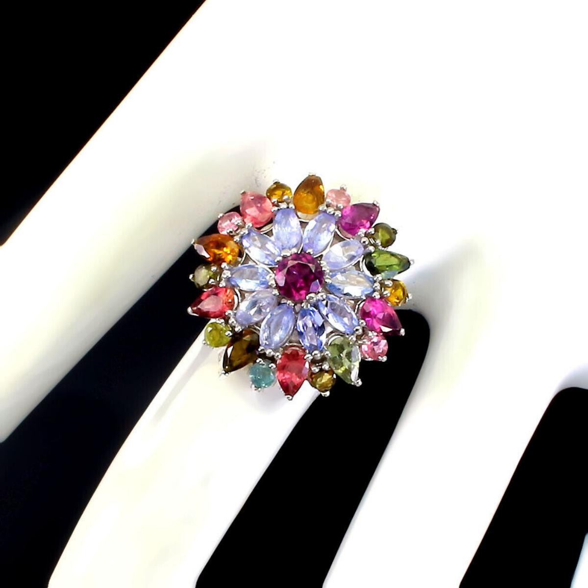 925 STERLING SILVER;PLATE-14K WHITE GOLD;RING SIZE-7.5(RESIZABLE);MAIN STONE-TANZANITE;OTHER GEMS-RHODOLITE GARNET, TOURMALINE;TOTAL WEIGHT-4.75 GRAM (TOTAL WEIGHT OF SILVER + STONE);DIMENSION-* STONE 2.5 TO 5.0 X 3.0 MM.* RING SIZE 7.5* FACE RING 23.0 X 22.0 MM.;MAIN STONE SHAPE-MARQUISE CUT;MAIN STONE COLOR- BLUE VIOLET;CLARITY/GRADE-IF TO VVS;TREATMENT-UNHEATED;ORIGIN-TANZANIA - AFRICA;HARDNESS-7.0 - 7.5;