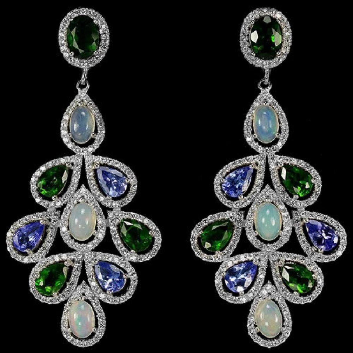 REAL TANZANITE OPAL CHROME DIOPSIDE CZ 925 SILVER EARRING 14K WHITE GOLD COATING; STONE SHAPE -OVAL CABOCHON CUT & PEAR, OVAL PORTUGESE CUT; STONE DIMENSION 7 X 5 MM. & 6 X 4 MM.; ITEM WEIGHT -13.96 GRAM; COLOR -MULTI COLOR; CLARITY -TRANLUCENT & IF- VVS; LUSTER -DAZZLING; TREATMENT -UNHEATED; ORIGIN OF STONE -RUSSIA, AFRICA & TANZANIA; HARDNESS -5.0 - 7.5; FACE OF EARRING -55 X 25 MM. ; WHITE CUBIC ZIRCONIA 1 MM.