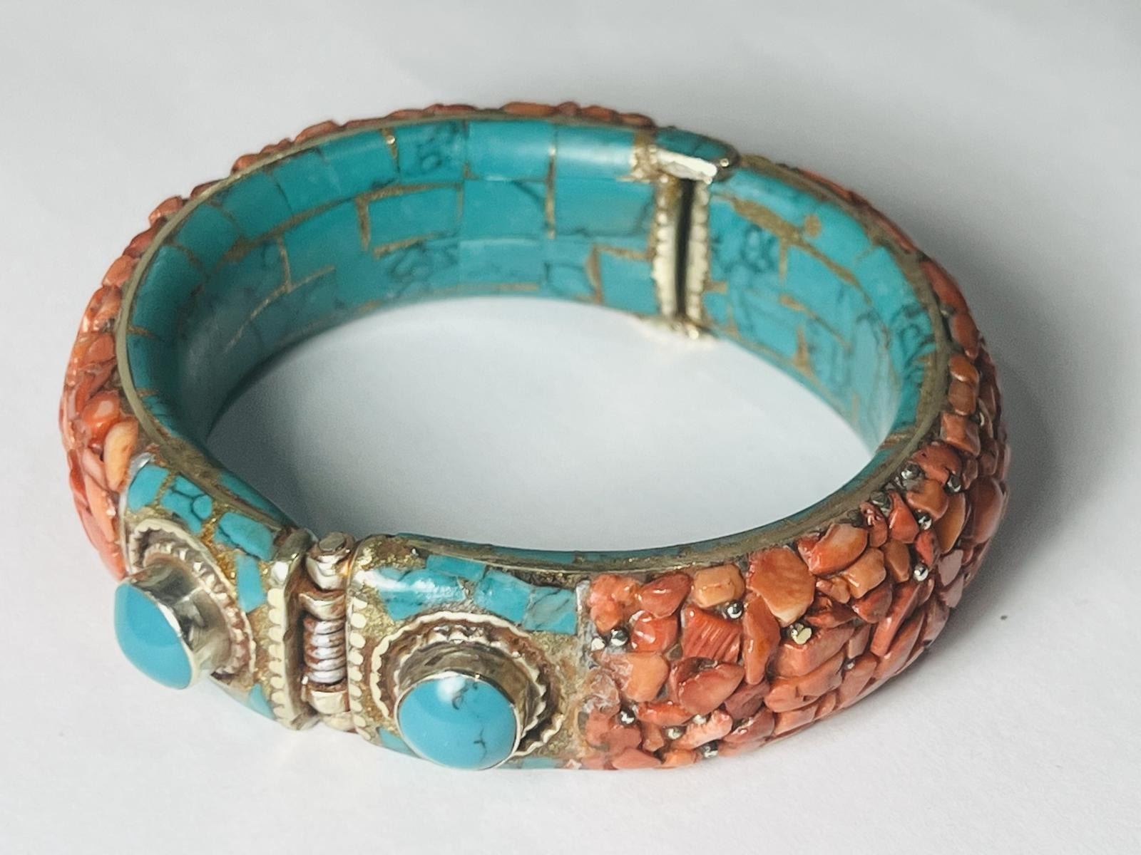 Natural Tibet Hand Made Coral & Turquoise free size Bangle.......This Bangle is made by Tibet Tribal ladies...completely natural stones....its free size as there is lock to open the bangle and fits all sizes.