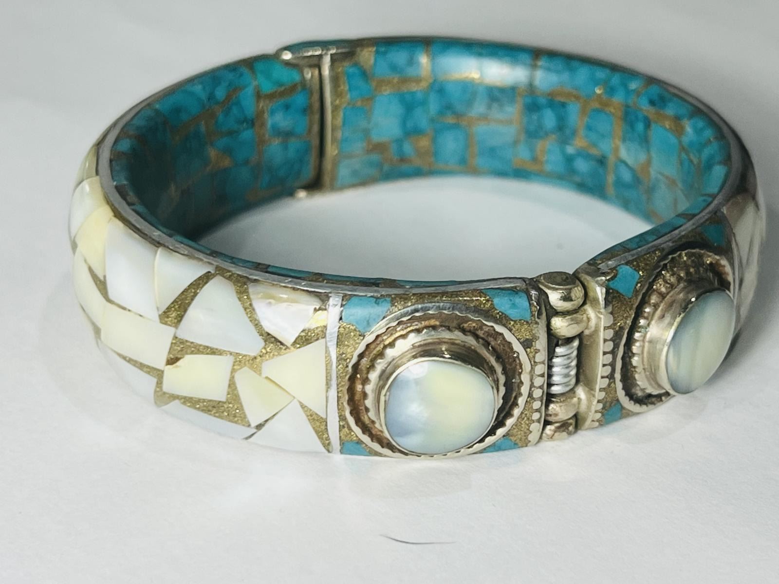 atural Tibet Hand Made Turquoise & Sea Shell free size Bangle.......This Bangle is made by Tibet Tribal ladies...completely natural stones....its free size as there is lock to open the bangle and fits all sizes.