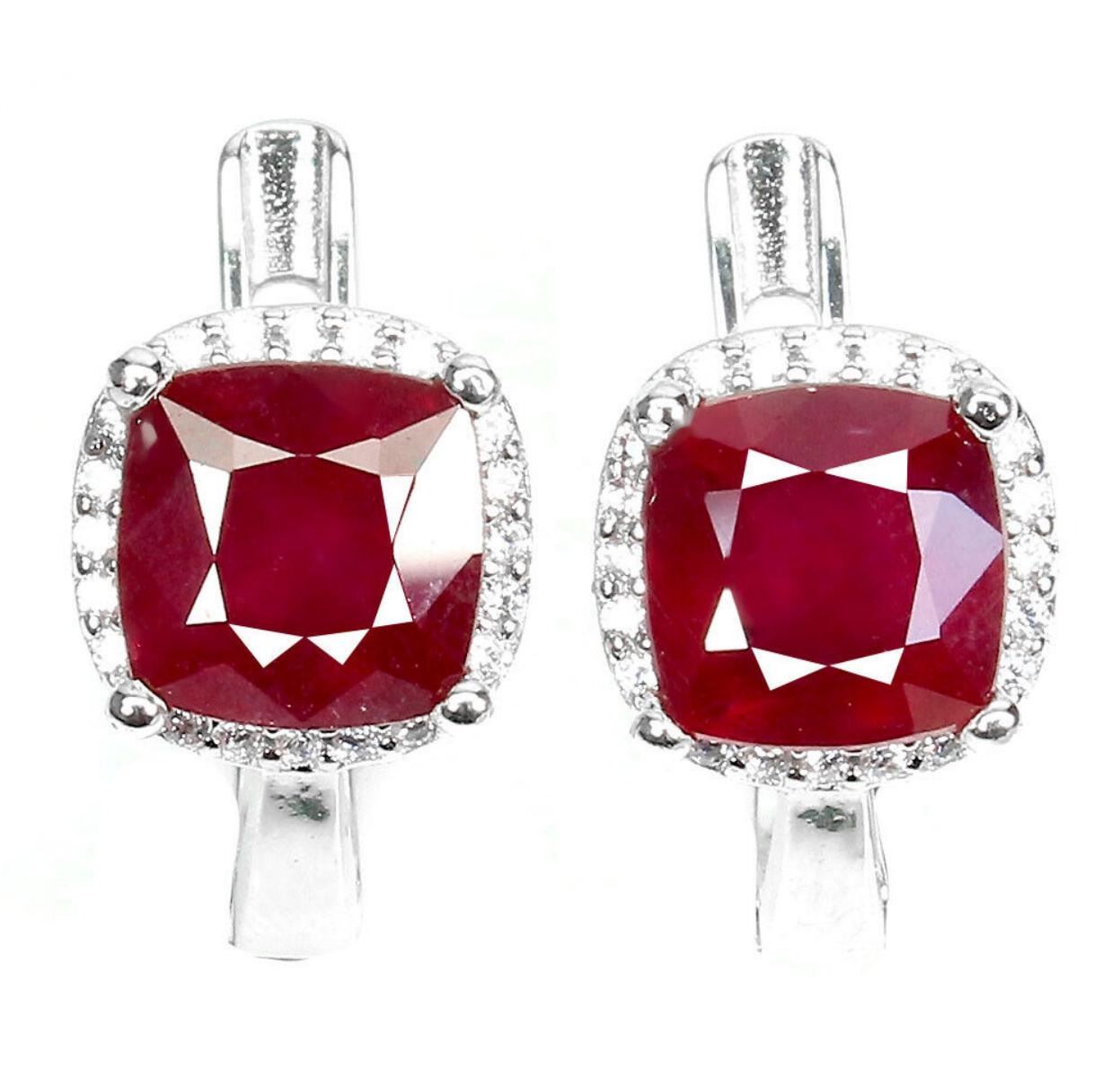 925 STERLING SILVER;PLATE-14K WHITE GOLD;MAIN STONE-RUBY;TOTAL WEIGHT-4.41 GRAM (TOTAL WEIGHT OF SILVER + STONE)DIMENSION-* STONE 7.0 MM. * CZ 1.0 MM. * FACE EARRINGS 13.0 X 9.0 MM.MAIN STONE SHAPE-CUSHION CUT;MAIN STONE COLOR-TOP BLOOD RED;TREATMENT-Yes;ORIGIN-MADAGASCAR;HARDNESS-9;