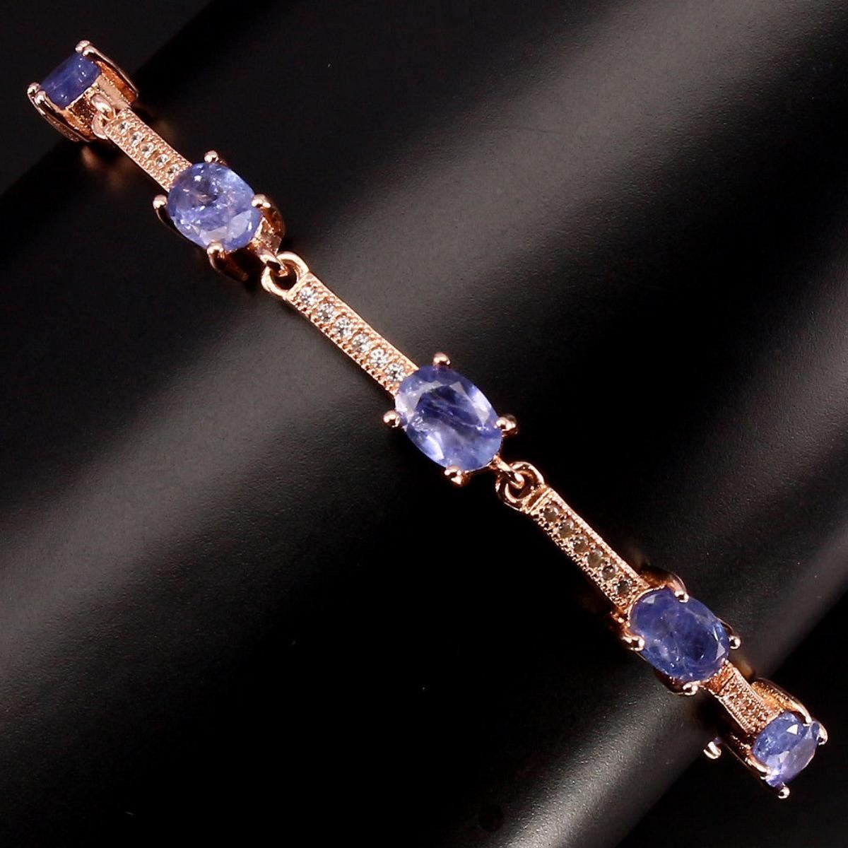 925 STERLING SILVER;PLATE14K ROSE GOLD;LENGTH (INCHES)11;MAIN STONETANZANITE;OTHER GEMSCUBIC ZIRCONIA;TOTAL WEIGHT28.39 CT (TOTAL WEIGHT OF SILVER + STONE)DIMENSION* STONE 6.0 X 4.0 MM. * CZ 1.0 MM. * FACE BRACELET 95.0 X 4.0 MM.;MAIN STONE SHAPEOVAL CUT;MAIN STONE COLORTOP RICH BLUE VIOLET;CLARITY/GRADETRANSPARENT;LUSTERBEWITCHING;TREATMENTUNHEATED;ORIGINTANZANIA - AFRICA;HARDNESS7.0 - 7.5
