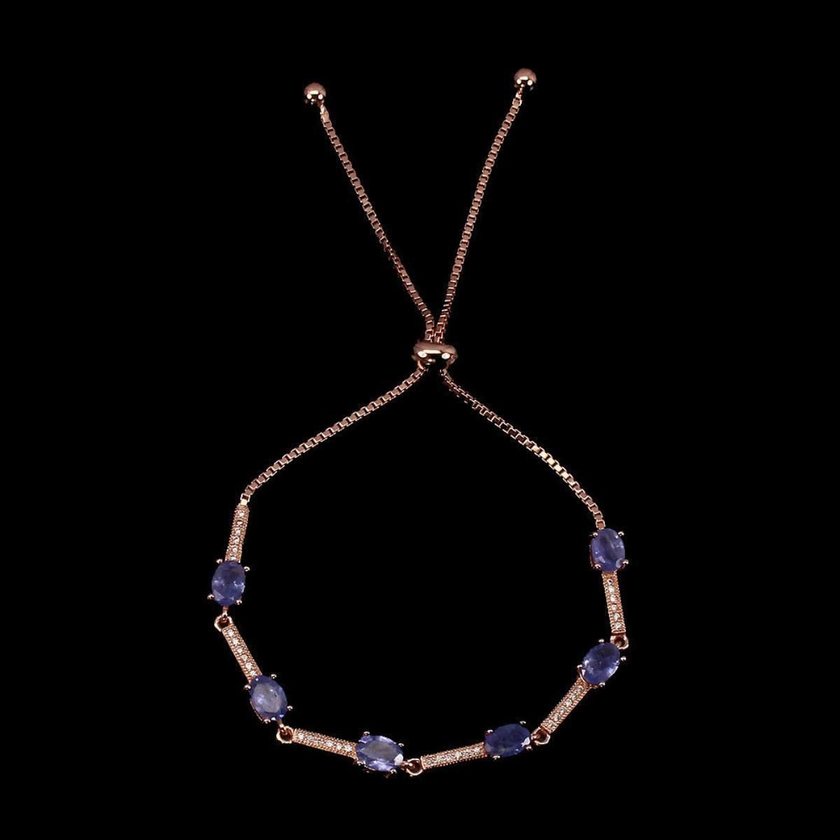 925 STERLING SILVER;PLATE14K ROSE GOLD;LENGTH (INCHES)11;MAIN STONETANZANITE;OTHER GEMSCUBIC ZIRCONIA;TOTAL WEIGHT28.39 CT (TOTAL WEIGHT OF SILVER + STONE)DIMENSION* STONE 6.0 X 4.0 MM. * CZ 1.0 MM. * FACE BRACELET 95.0 X 4.0 MM.;MAIN STONE SHAPEOVAL CUT;MAIN STONE COLORTOP RICH BLUE VIOLET;CLARITY/GRADETRANSPARENT;LUSTERBEWITCHING;TREATMENTUNHEATED;ORIGINTANZANIA - AFRICA;HARDNESS7.0 - 7.5