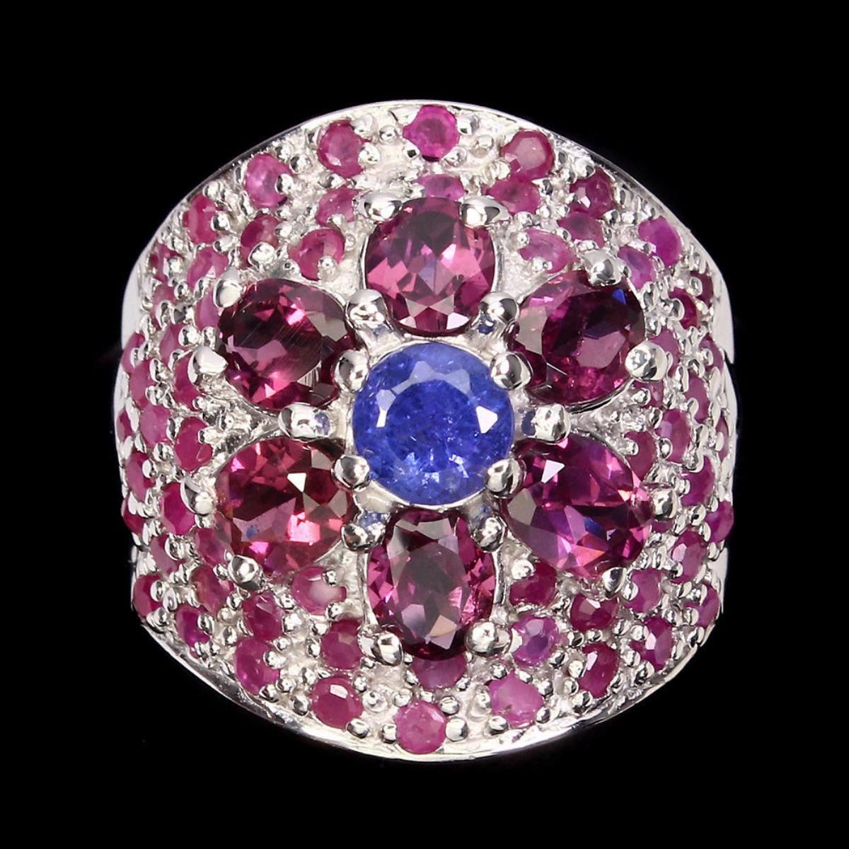 925 STERLING SILVER;PLATE14K WHITE GOLD;RING SIZE8.5 (resizeable)MAIN STONETANZANITEOTHER GEMSRHODOLITE GARNET,RUBYTOTAL WEIGHT39.08 CT (TOTAL WEIGHT OF SILVER + STONE)DIMENSION* STONE 2.0 TO 5.0 X 4.0 MM. * FACE RING 21.0 X 21.0 MM.;MAIN STONE SHAPEROUND CUT;MAIN STONE COLORTOP RICH BLUE VIOLET;CLARITY/GRADEIF TO VVS;LUSTERGORGEOUS;TREATMENTUNHEATED;ORIGINTANZANIA - AFRICA;HARDNESS7.0 - 7.5;