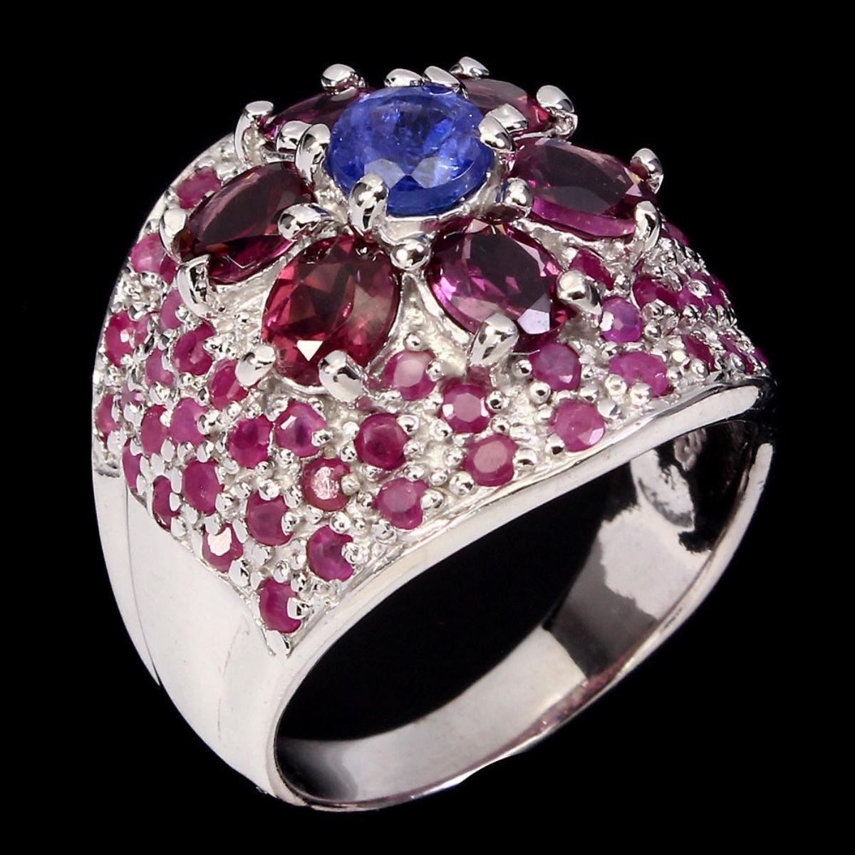 925 STERLING SILVER;PLATE14K WHITE GOLD;RING SIZE8.5 (resizeable)MAIN STONETANZANITEOTHER GEMSRHODOLITE GARNET,RUBYTOTAL WEIGHT39.08 CT (TOTAL WEIGHT OF SILVER + STONE)DIMENSION* STONE 2.0 TO 5.0 X 4.0 MM. * FACE RING 21.0 X 21.0 MM.;MAIN STONE SHAPEROUND CUT;MAIN STONE COLORTOP RICH BLUE VIOLET;CLARITY/GRADEIF TO VVS;LUSTERGORGEOUS;TREATMENTUNHEATED;ORIGINTANZANIA - AFRICA;HARDNESS7.0 - 7.5;