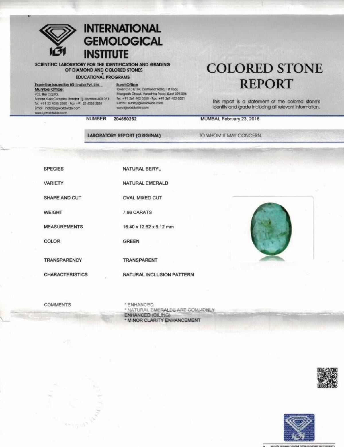 Natural Top Emerald 7.66 Carats........Oval Shape... oil treatment only....Certified By IGI Lab