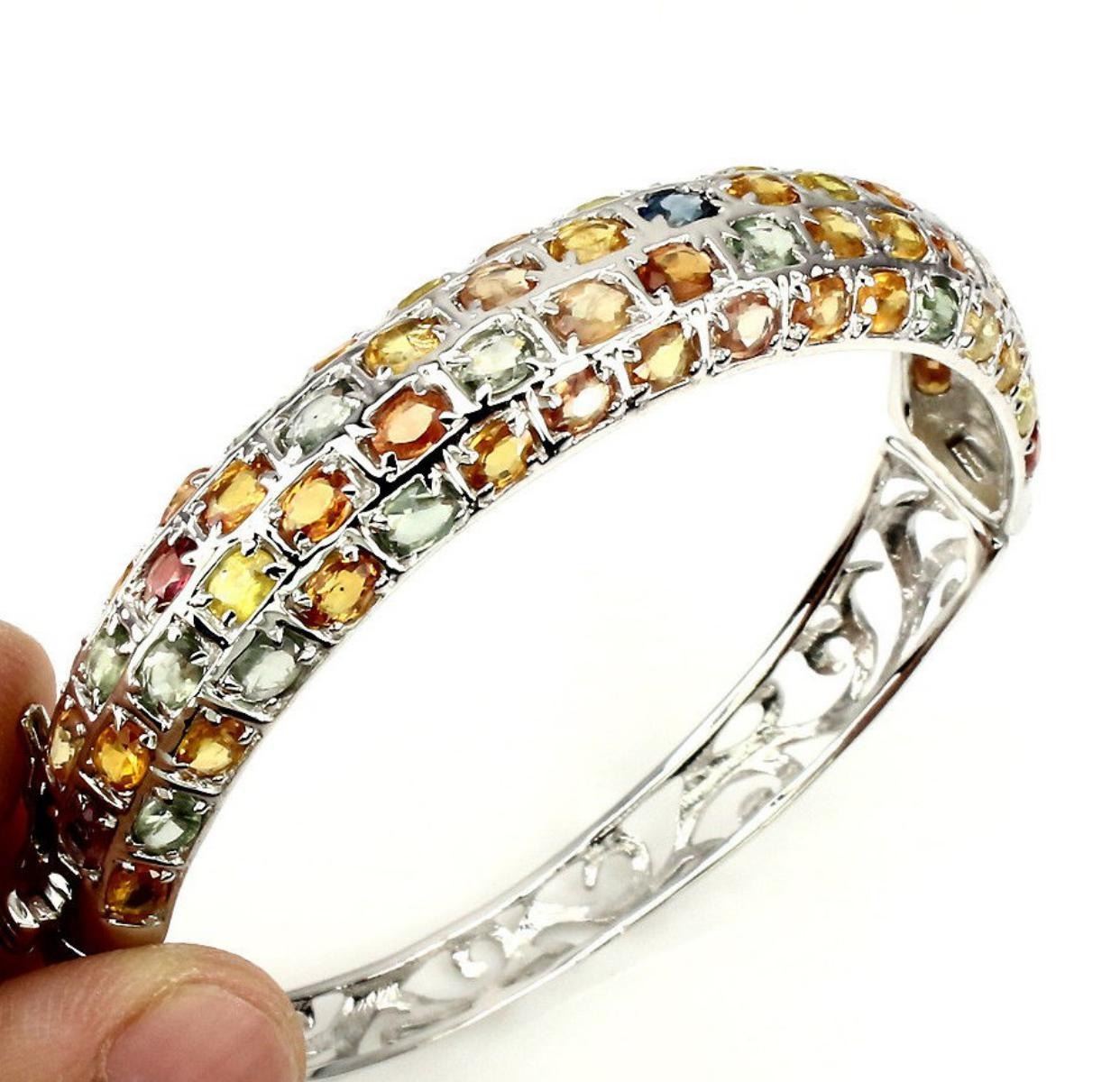 925 STERLING SILVER...PLATE....14K WHITE GOLD....MAIN STONE....SAPPHIRE....OTHER GEMSTOTAL WEIGHT117.32 CT (TOTAL WEIGHT OF SILVER + STONE)DIMENSION* STONE 4.0 X 3.0 MM. * DIAMETER 2.2 X 2.1 INCHES. * FACE BANGLE 64.0 X 10.0 MM..MAIN STONE SHAPEOVAL CUTMAIN STONE COLORMULTI-COLORCLARITY/GRADEIF TO VVSLUSTERPRECIOUSTREATMENTHEATEDORIGIN- AFRICAHARDNESS9.0