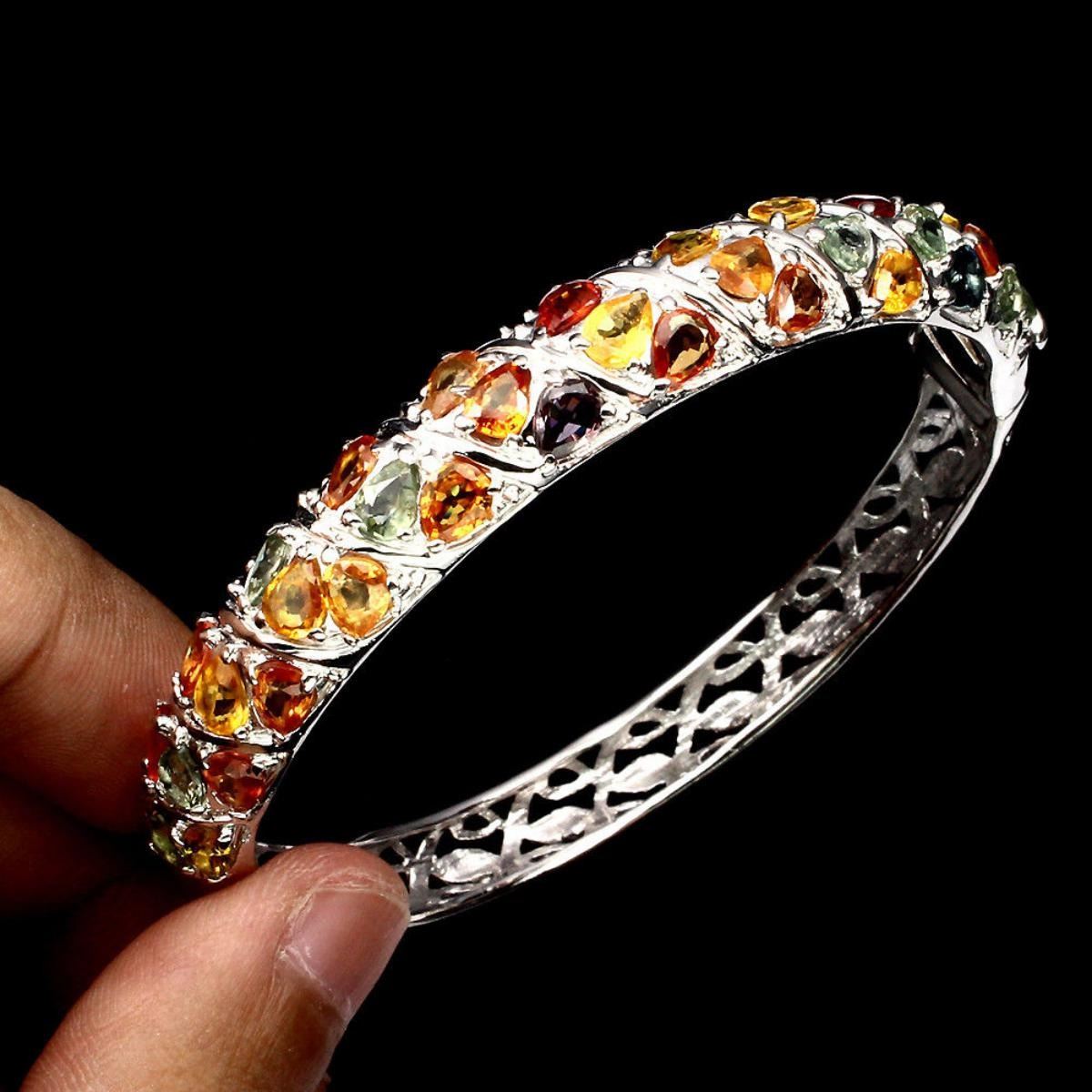 925 STERLING SILVER PLATE 14K WHITE GOLD RING SIZE/LENGTH (INCHES) MAIN STONE SAPPHIRE OTHER GEMS TOTAL WEIGHT 127.08 CT (TOTAL WEIGHT OF SILVER + STONE) DIMENSION * STONE 6.0 X 4.0 MM. * DIAMETER 2.4 X 2.3 INCHES. * FACE BANGLE 69.0 X 10.0 MM. MAIN STONE SHAPE PEAR CUT MAIN STONE COLOR MULTI-COLOR CLARITY/GRADE IF TO VVS LUSTER MESMERIZING TREATMENT HEATED ORIGIN SONGEA - AFRICA HARDNESS 9.0