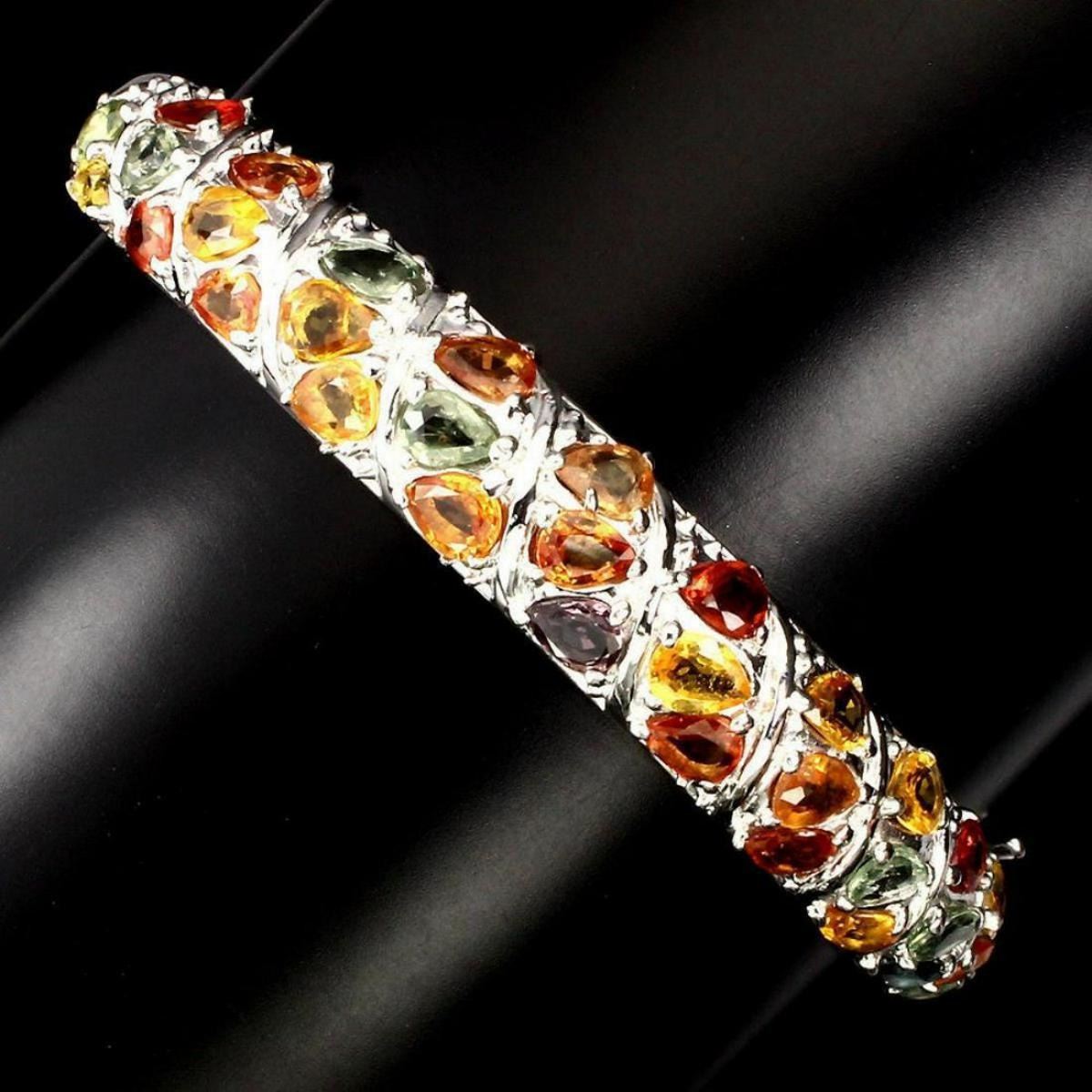 925 STERLING SILVER PLATE 14K WHITE GOLD RING SIZE/LENGTH (INCHES) MAIN STONE SAPPHIRE OTHER GEMS TOTAL WEIGHT 127.08 CT (TOTAL WEIGHT OF SILVER + STONE) DIMENSION * STONE 6.0 X 4.0 MM. * DIAMETER 2.4 X 2.3 INCHES. * FACE BANGLE 69.0 X 10.0 MM. MAIN STONE SHAPE PEAR CUT MAIN STONE COLOR MULTI-COLOR CLARITY/GRADE IF TO VVS LUSTER MESMERIZING TREATMENT HEATED ORIGIN SONGEA - AFRICA HARDNESS 9.0
