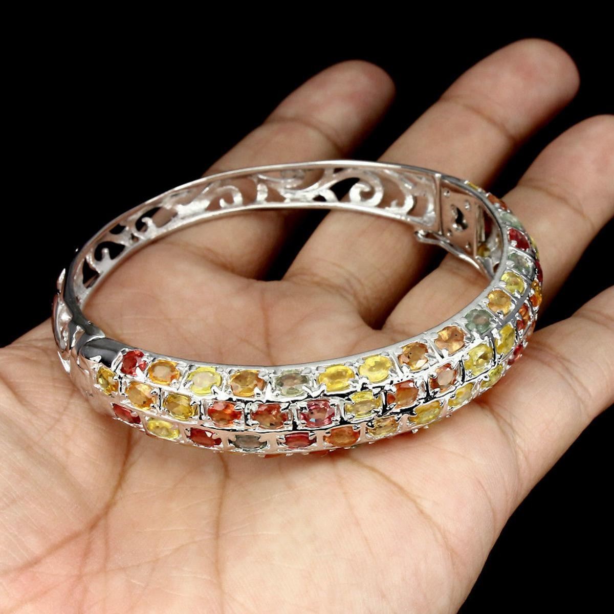 925 STERLING SILVERPLATE14K WHITE GOLD;MAIN STONE...SAPPHIRE;OTHER GEMSTOTAL WEIGHT117.32 CT (TOTAL WEIGHT OF SILVER + STONE)DIMENSION* STONE 4.0 X 3.0 MM. * DIAMETER 2.2 X 2.1 INCHES. * FACE BANGLE 64.0 X 10.0 MM.MAIN STONE SHAPEOVAL CUTMAIN STONE COLORMULTI-COLORCLARITY/GRADEIF TO VVSLUSTERPRECIOUSTREATMENTHEATEDORIGINSONGEA - AFRICAHARDNESS9.0