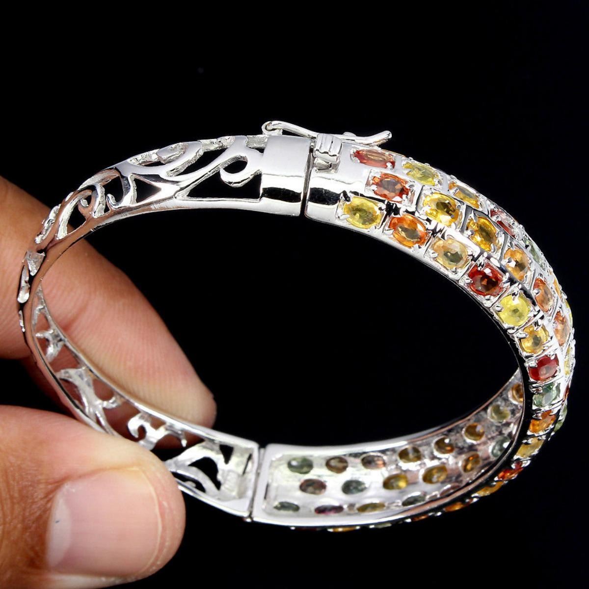 925 STERLING SILVER;PLATE....14K WHITE GOLD;MAIN STONESAPPHIRE;OTHER GEMSTOTAL WEIGHT117.87 CT (TOTAL WEIGHT OF SILVER + STONE)DIMENSION* STONE 4.0 X 3.0 MM. * DIAMETER 2.2 X 2.1 INCHES. * FACE BANGLE 64.0 X 12.0 MM.MAIN STONE SHAPEOVAL CUTMAIN STONE COLORTOP FANCY COLORSCLARITY/GRADEIF TO VVSLUSTERGRACIOUSTREATMENTHEATED;ORIGIN - AFRICA;HARDNESS9;