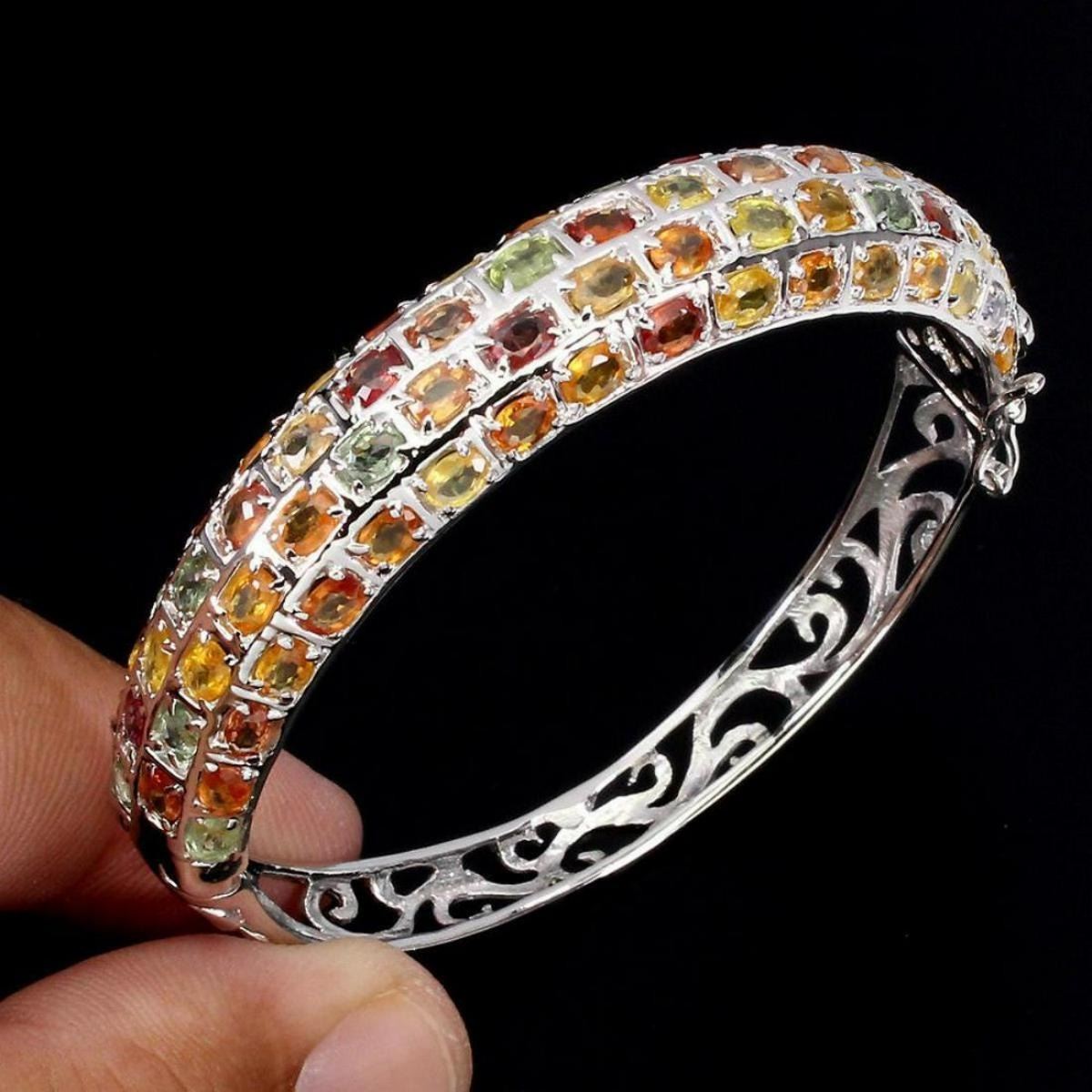 925 STERLING SILVER;PLATE....14K WHITE GOLD;MAIN STONESAPPHIRE;OTHER GEMSTOTAL WEIGHT117.87 CT (TOTAL WEIGHT OF SILVER + STONE)DIMENSION* STONE 4.0 X 3.0 MM. * DIAMETER 2.2 X 2.1 INCHES. * FACE BANGLE 64.0 X 12.0 MM.MAIN STONE SHAPEOVAL CUTMAIN STONE COLORTOP FANCY COLORSCLARITY/GRADEIF TO VVSLUSTERGRACIOUSTREATMENTHEATED;ORIGIN - AFRICA;HARDNESS9;